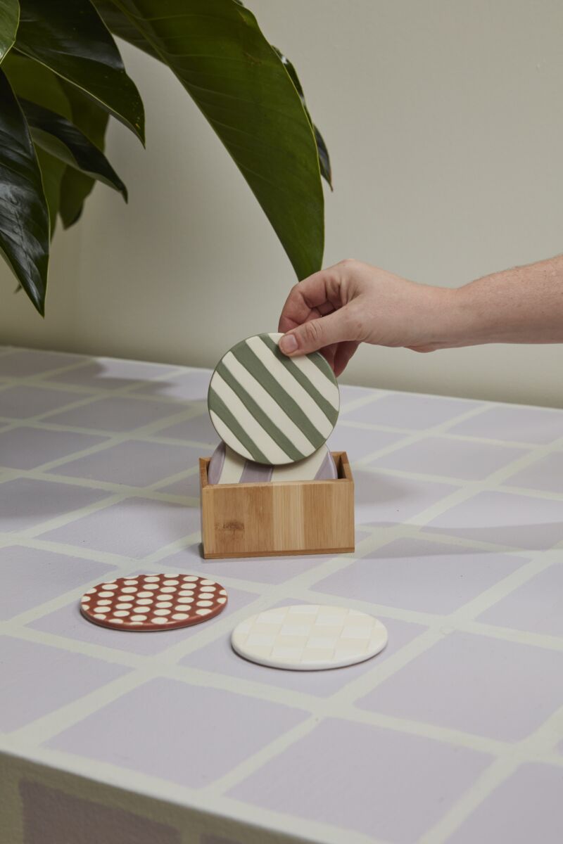 Bring trendy color & playful patterns to a coffee table or dining surfaces with the stoneware clay Havana Coaster Set. This set of 4 unique, hand painted coasters comes in a bamboo box & features burnt orange polka dots, white checkerboard on natural bisque, green & white stripes, & purple waves. Perfect for merchandising in plant shop or home & gift stores, this set offers a handmade look & organic design to interiors.
