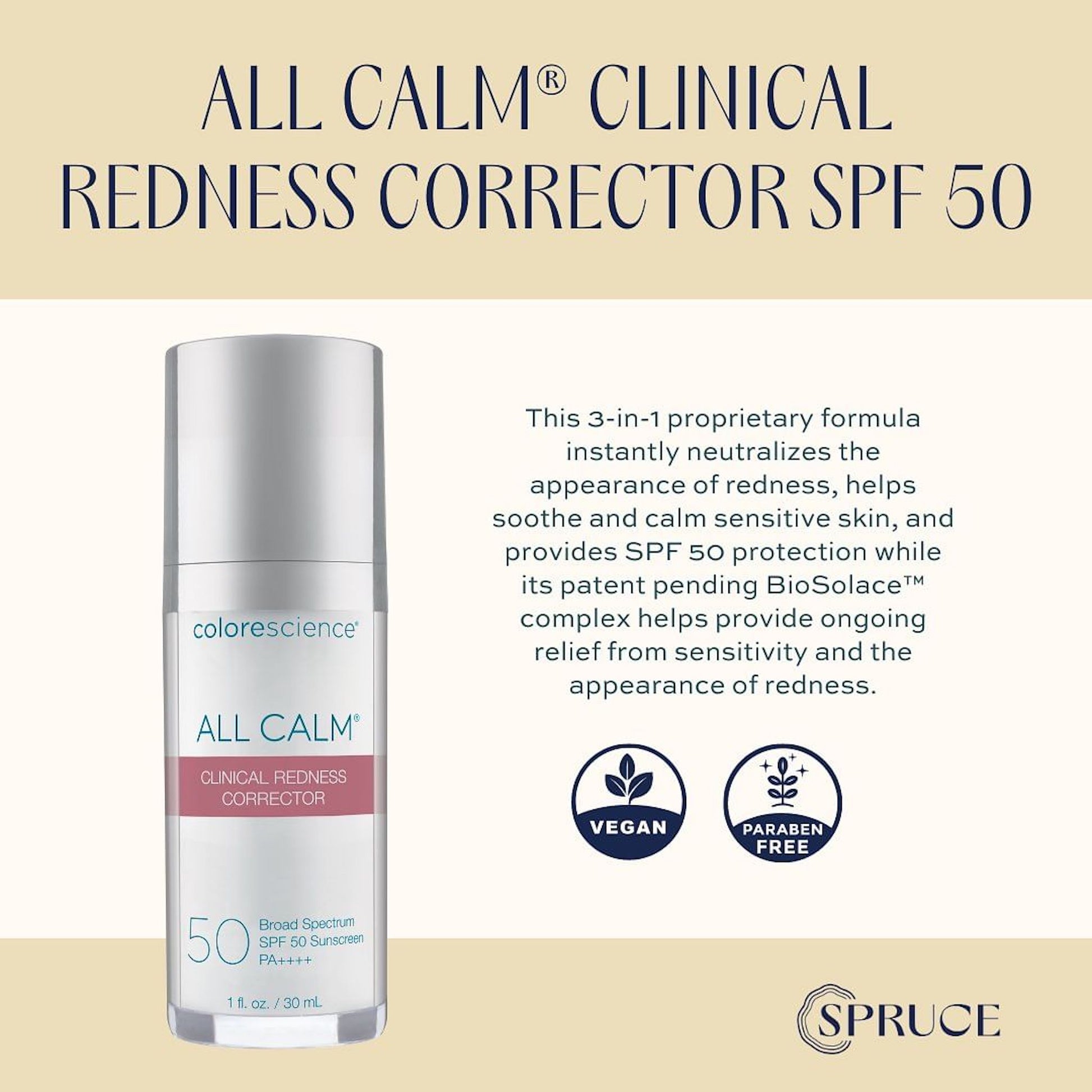 This 3-in-1 proprietary formula instantly neutralizes the appearance of redness, helps soothe and calm sensitive skin, and provides SPF 50 protection while its patent pending BioSolace™ complex helps provide ongoing relief from sensitivity and the appearance of redness.