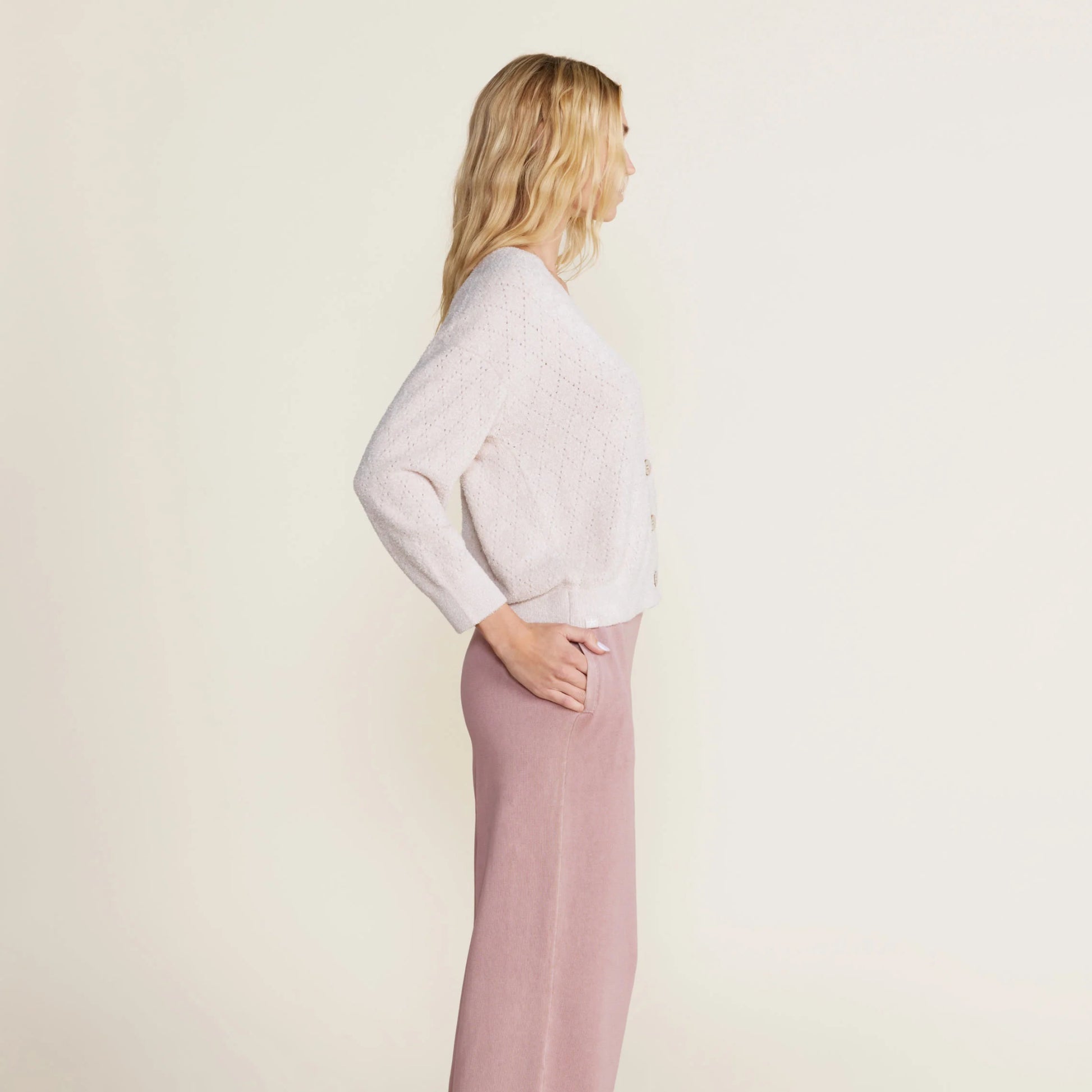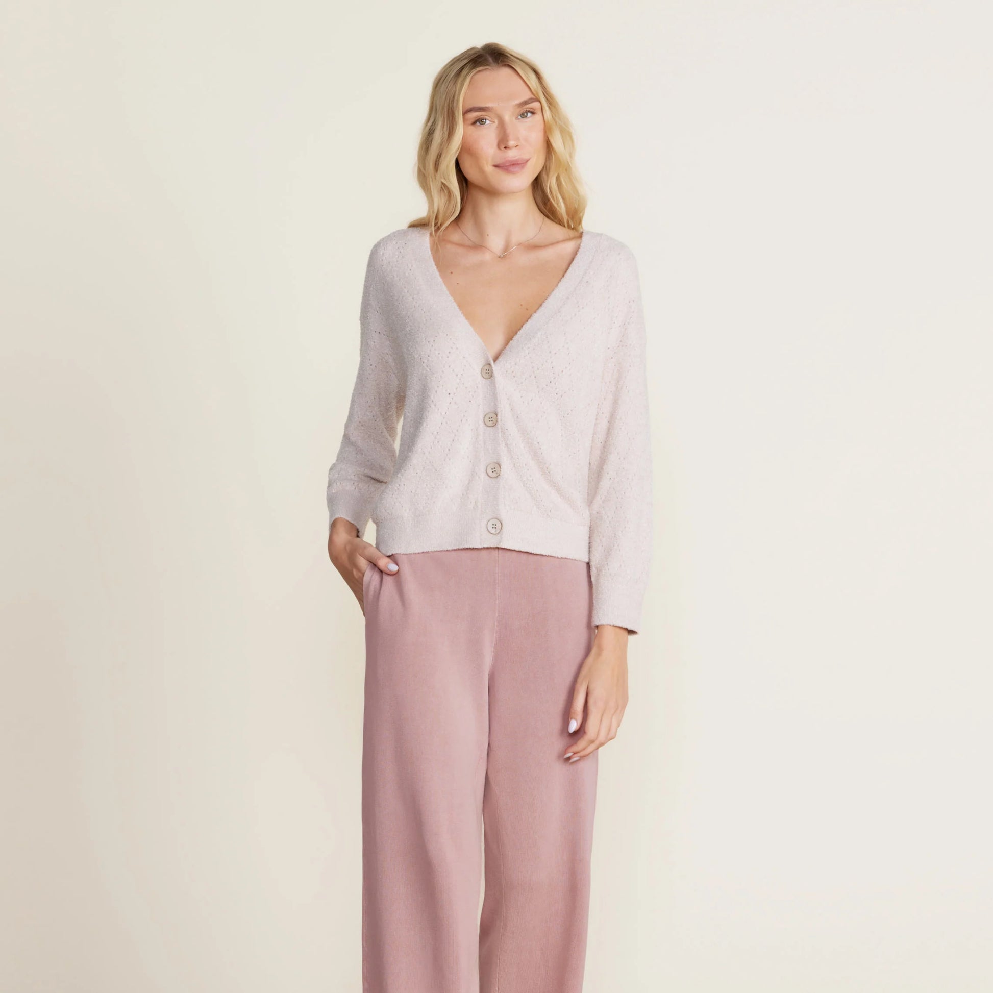 Stay stylish with the CozyChic Lite Diamond Pointelle Cardigan. Featuring a v-neck line, bracelet length sleeves, and all over diamond pointelle stitch, this cardigan will keep you looking fashionable. Added detail is found with the starfish engraved coconut buttons for a unique touch. Model between 5'11" and wearing a size Small.