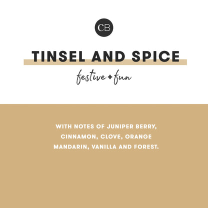 An elevated design and spirited fragrance make for the PERFECT holiday combination! Get in the holiday spirit with our 19 oz Tinsel & Spice Glimmer Signature Candle with notes of juniper berry, cinnamon and a twist of orange mandarin, vanilla and forest woods.
