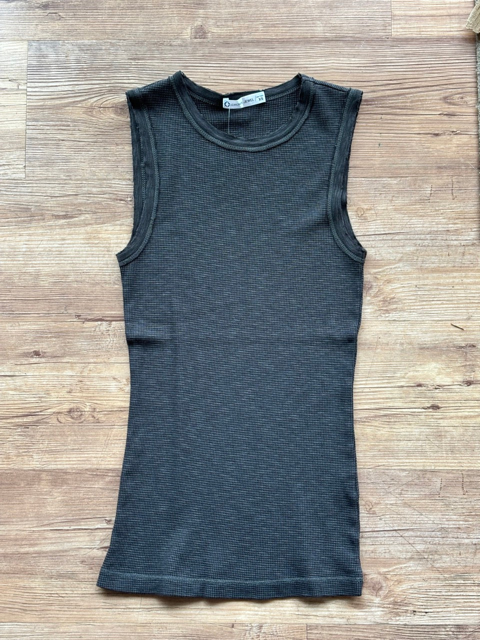 The binded edges are cut raw to enhance the look of a fashion tank. length is 24 inch(small) with a 1 inch hem line. Fabric is our 2x1 Luxe Rib with our DNA spandex for just the right amount of stretch.