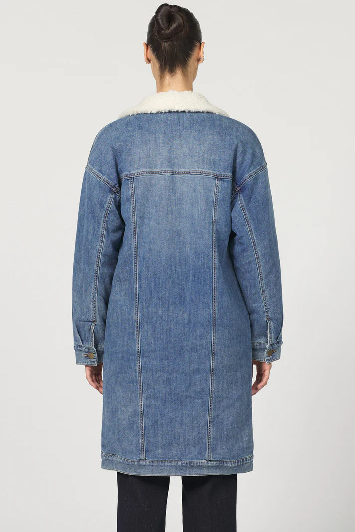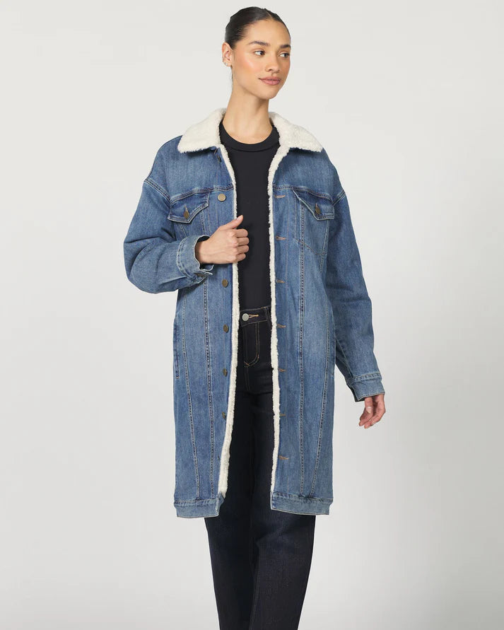 This relaxed denim jacket is made for cozy comfort with its longer length and sherpa lining.