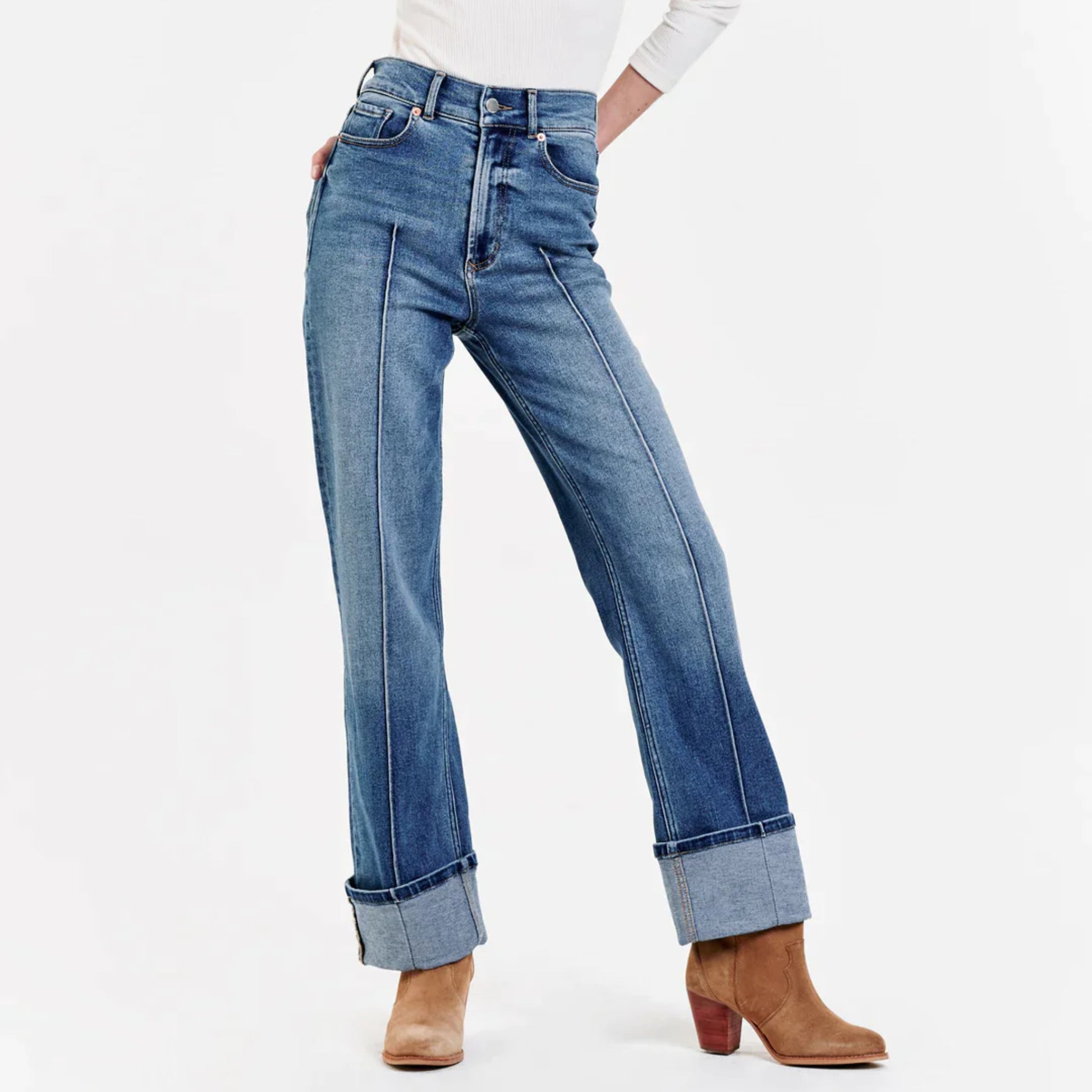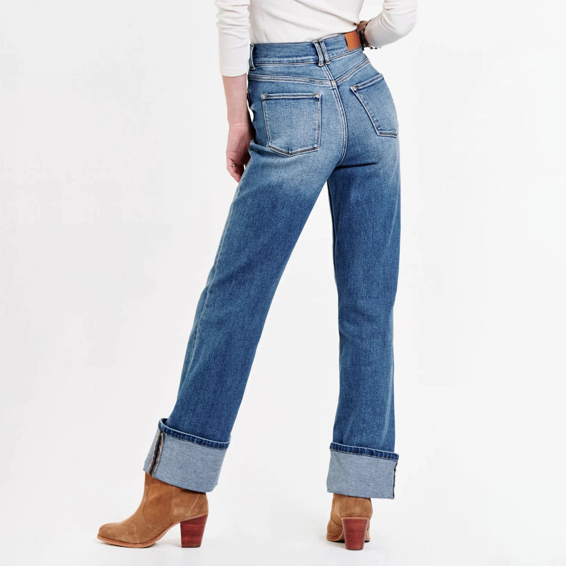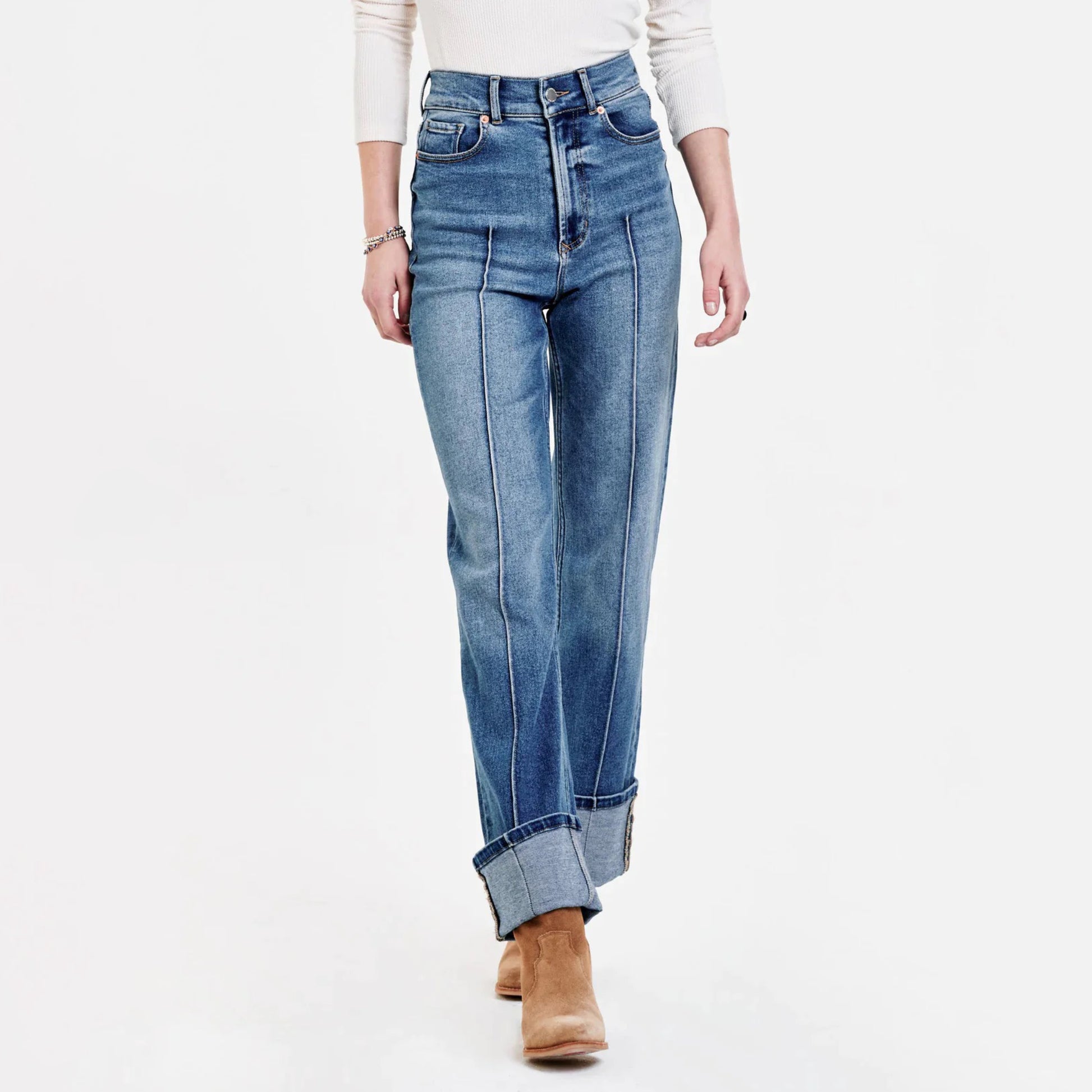 Super high rise cuffed straight leg jeans. It's the jolly fit that sits slightly lower on the waist and fitted easy & straight from the hip to mid thigh. Cuffed inseam on comfort stretch denim accented with pintuck front center dart seams, wide hem band finish, washed in effortless shade for any pairings.