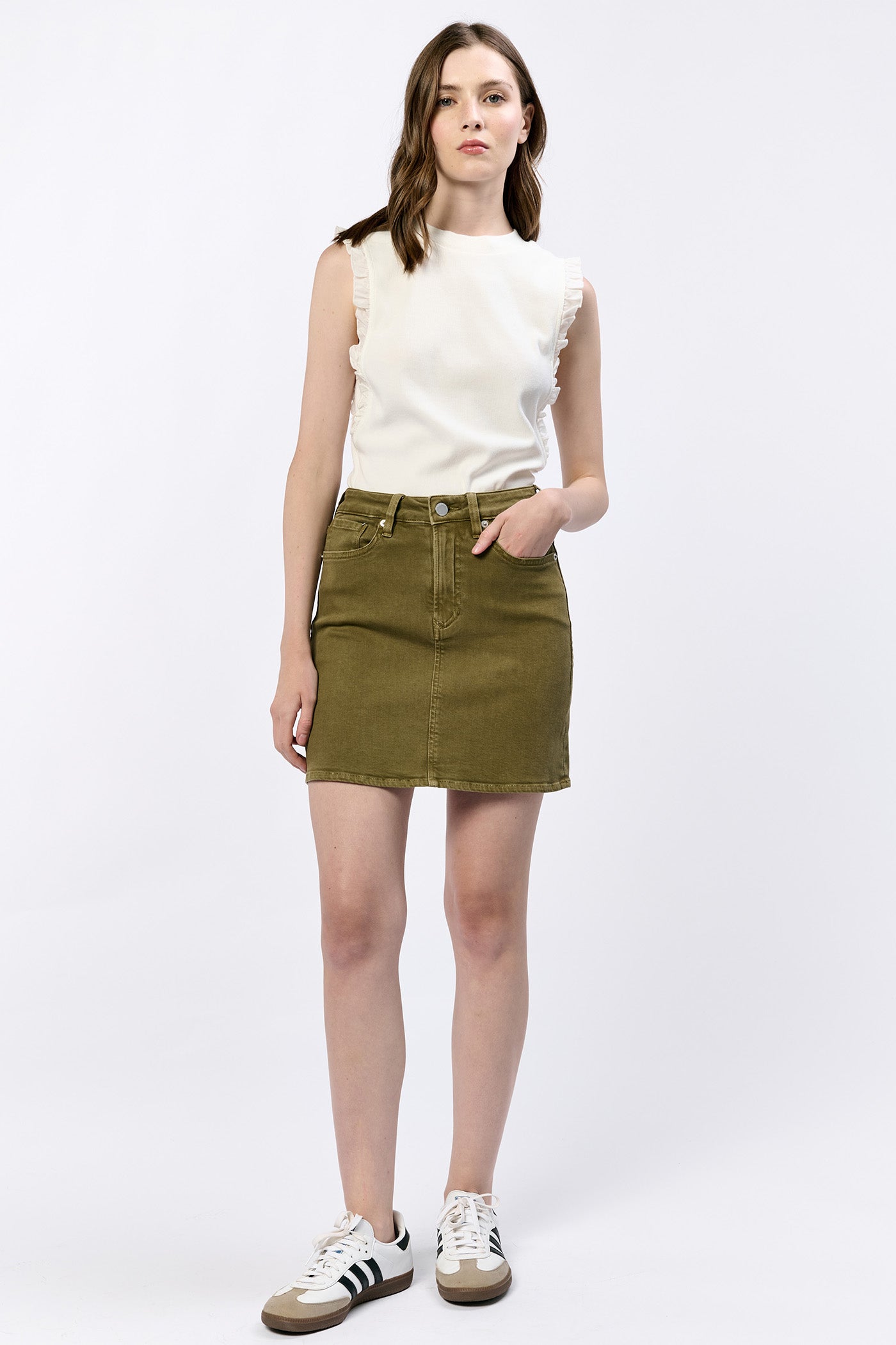 Skirt inseam on stretch denim in designer color palettes, washed for softness.