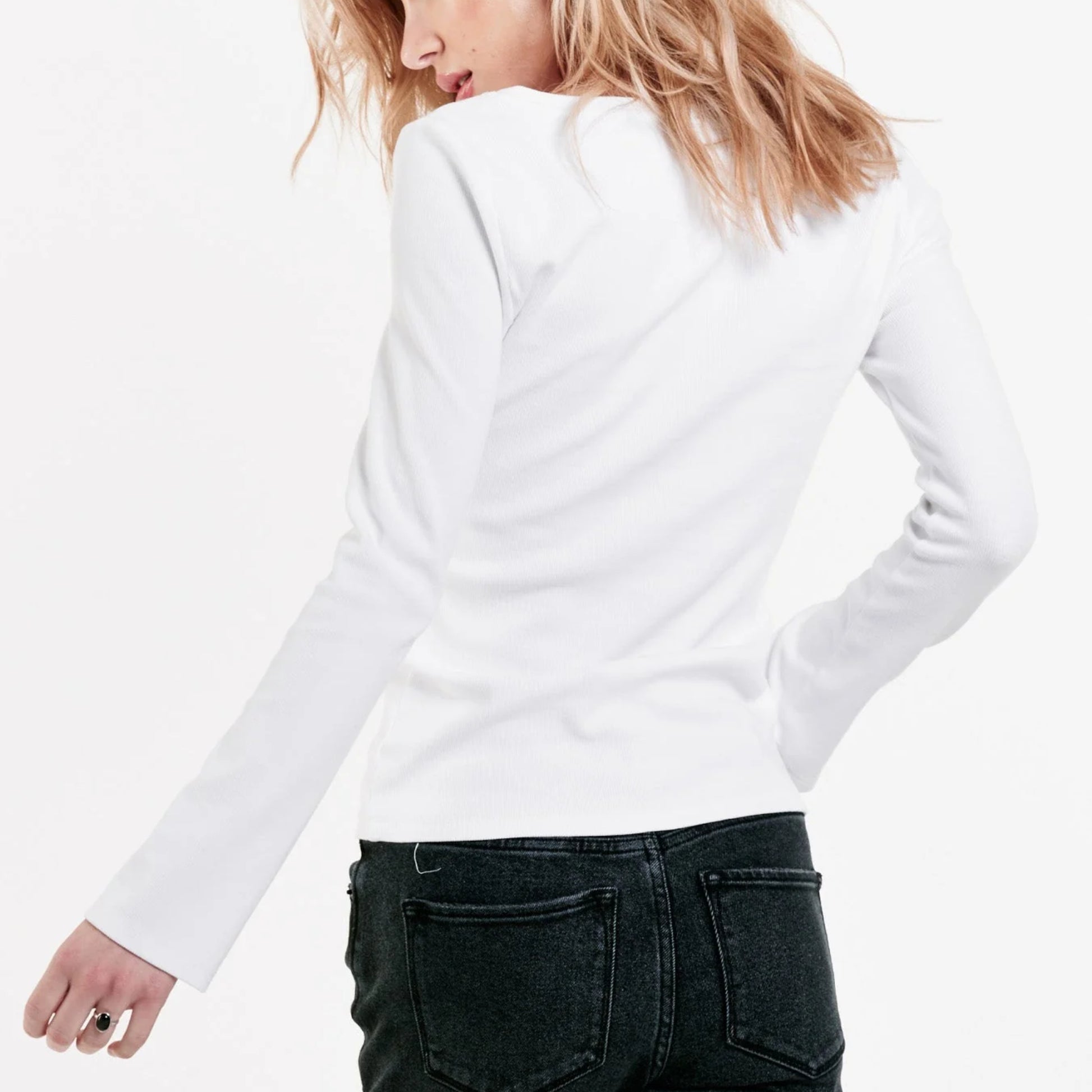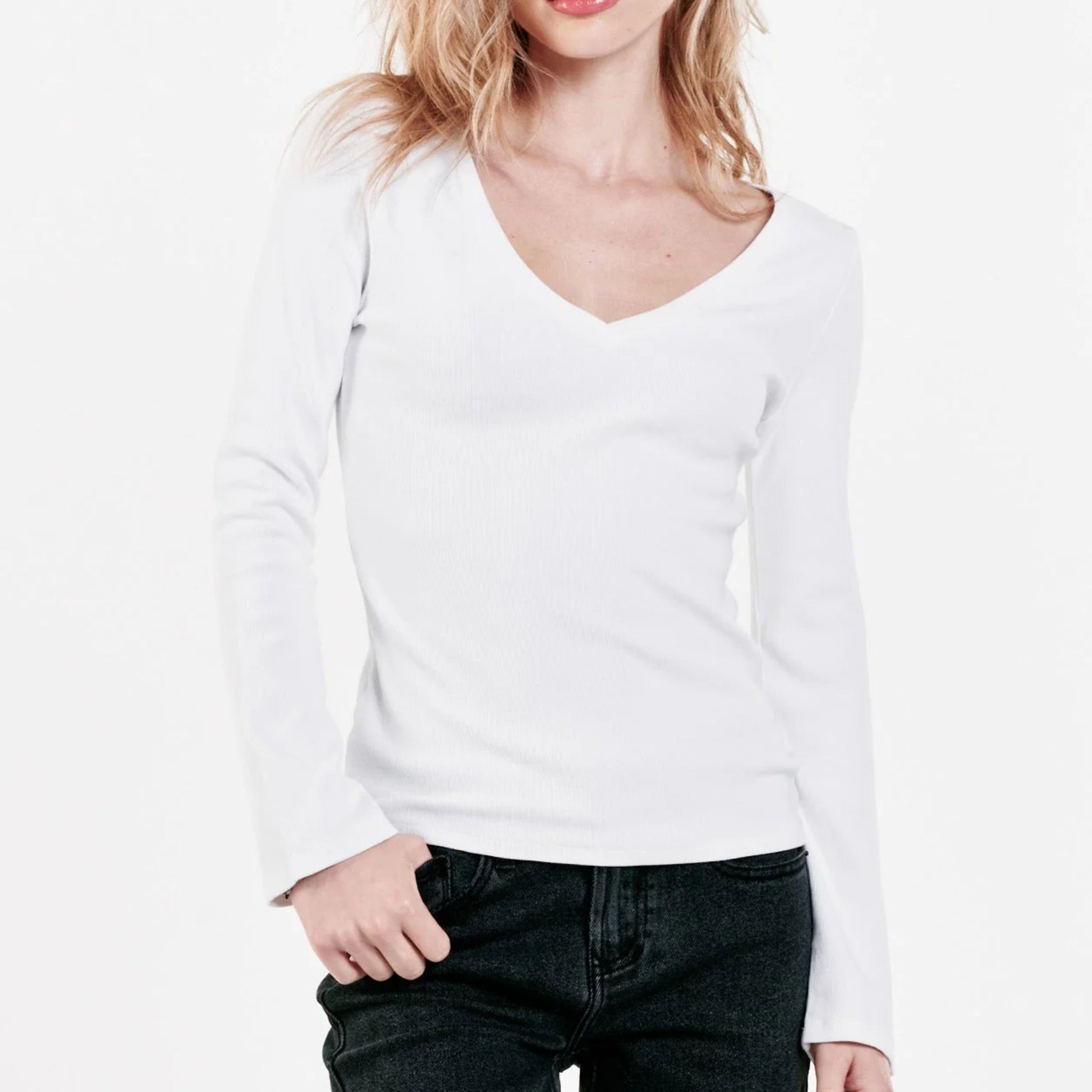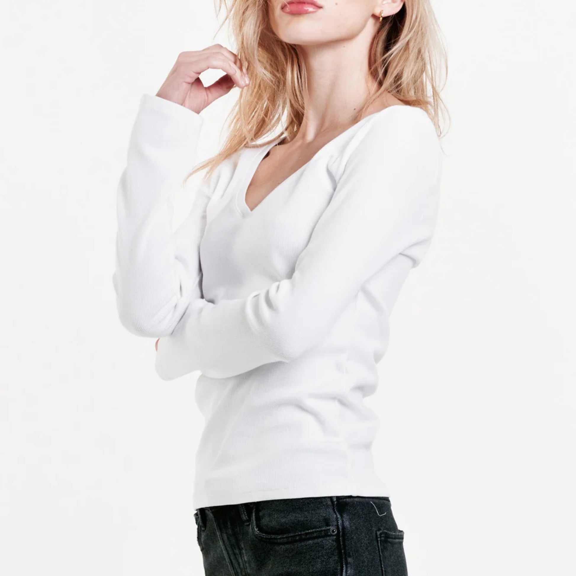 Long sleeve v-neck top in rib texture with self neck band. Flexible, plush, ready pairing for any lifestyle, simply "perfect" for all you do! Solid color knit fitted.