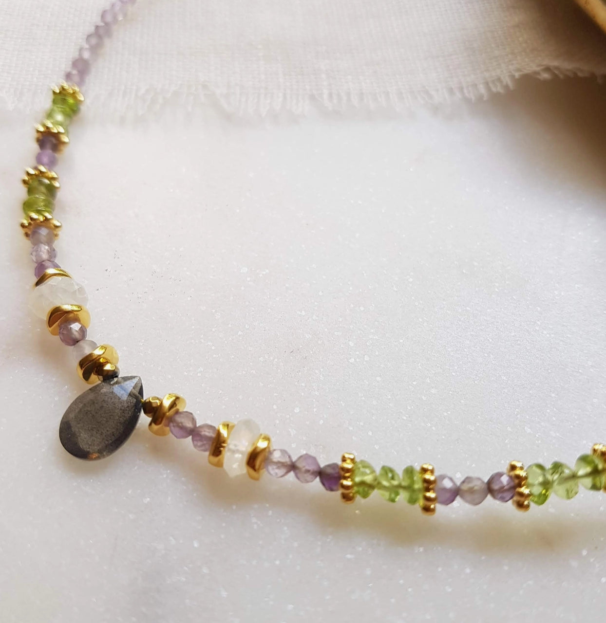 Ginandger Necklace with labradorite, amethysts, peridots, moonstones and gold charms Measures approx 36 +5cm extension Delivered in its own pouch *please note that each stone is unique, so your jewel may be slightly different from the picture. Details