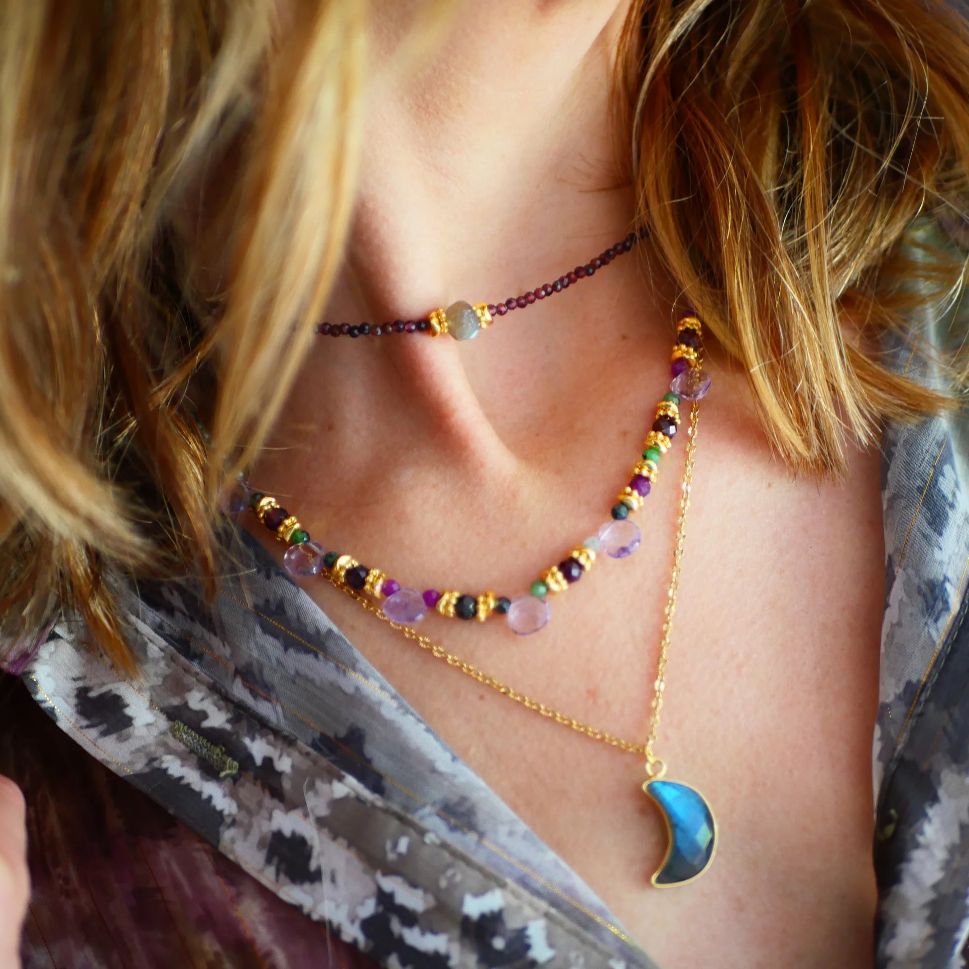 Mahima is a true source of energy and vitality. The combination of ruby zoisite, amethyst and garnet creates a perfect balance between strength, intuition and protection.
