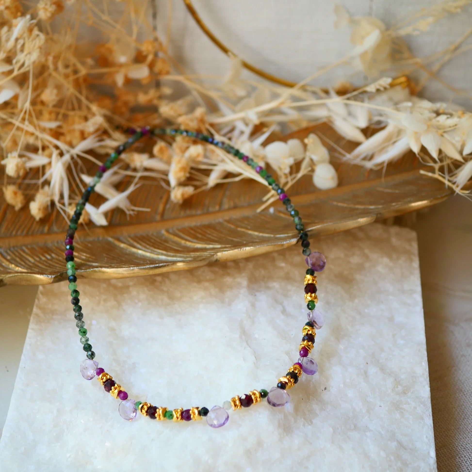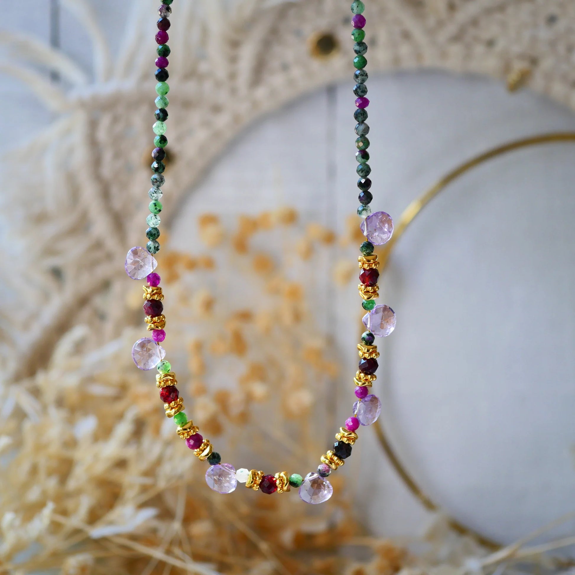 Stainless steel necklace, composed of rubies, zoisites, amethysts, garnets and fine gold-plated charms.