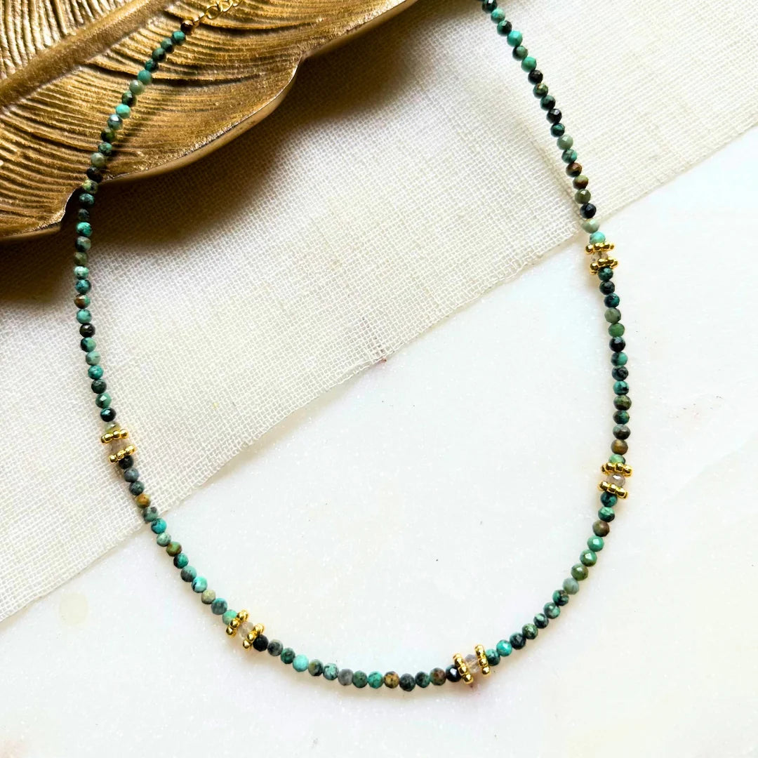 This necklace is designed to help you connect with the power of the earth and the universe. Turquoise stones are known to promote self-expression and communication while labradorite is associated with magic and intuition. Together, these stones create a powerful energy that can help you overcome life's challenges with grace and courage.