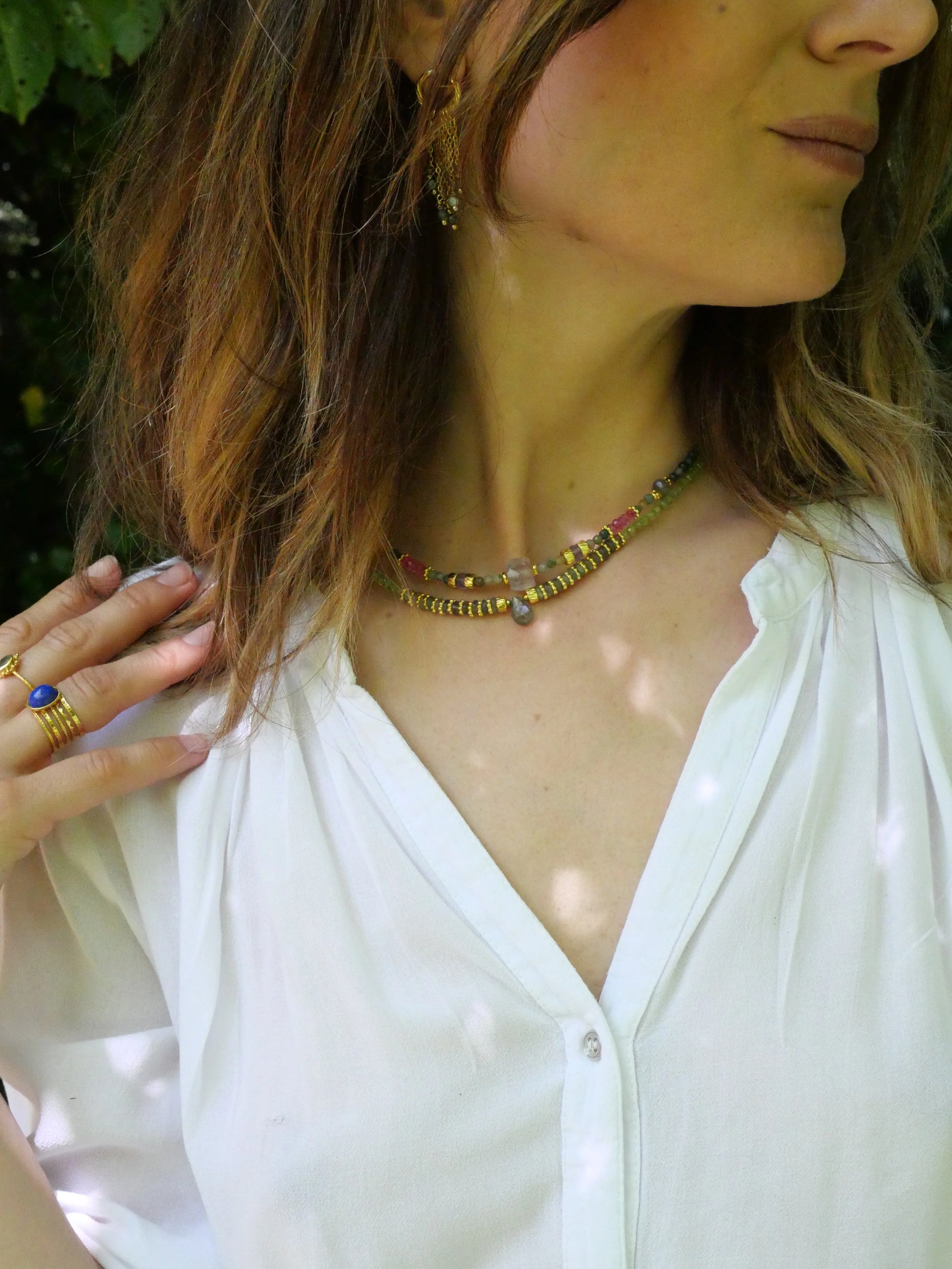 Stainless steel necklace made of peridots, labradorites and fine gold-plated charms.