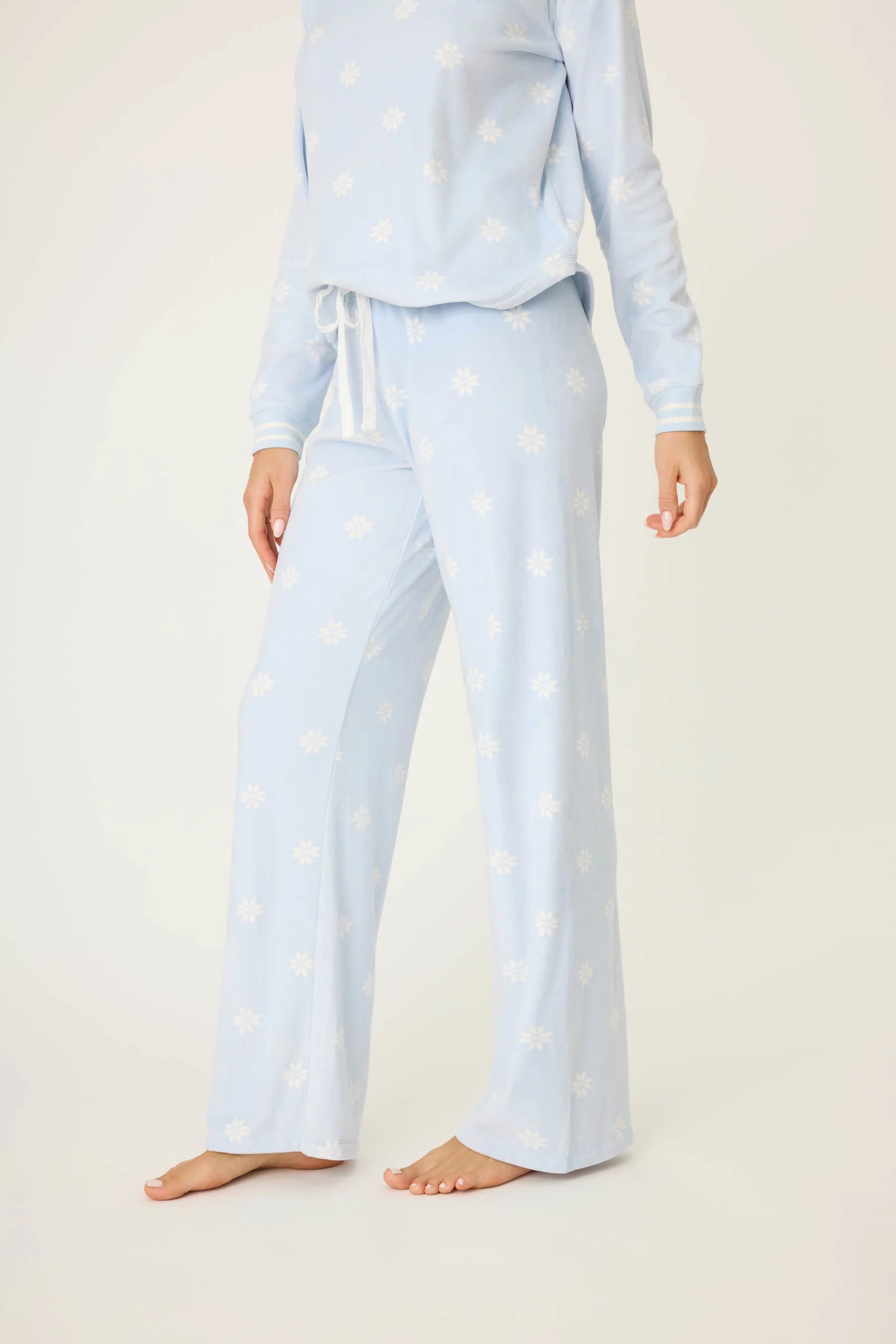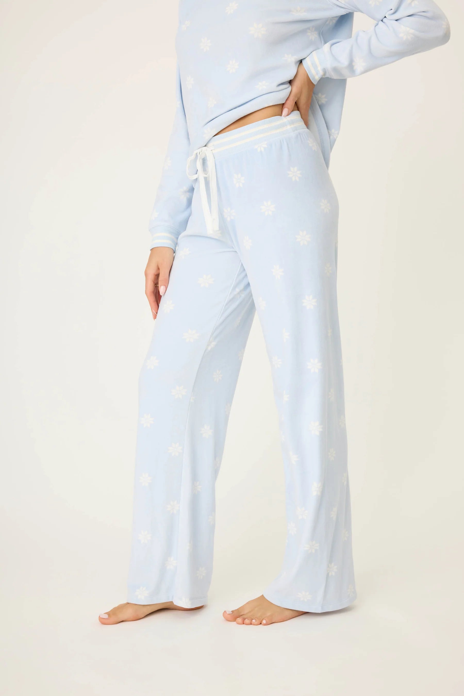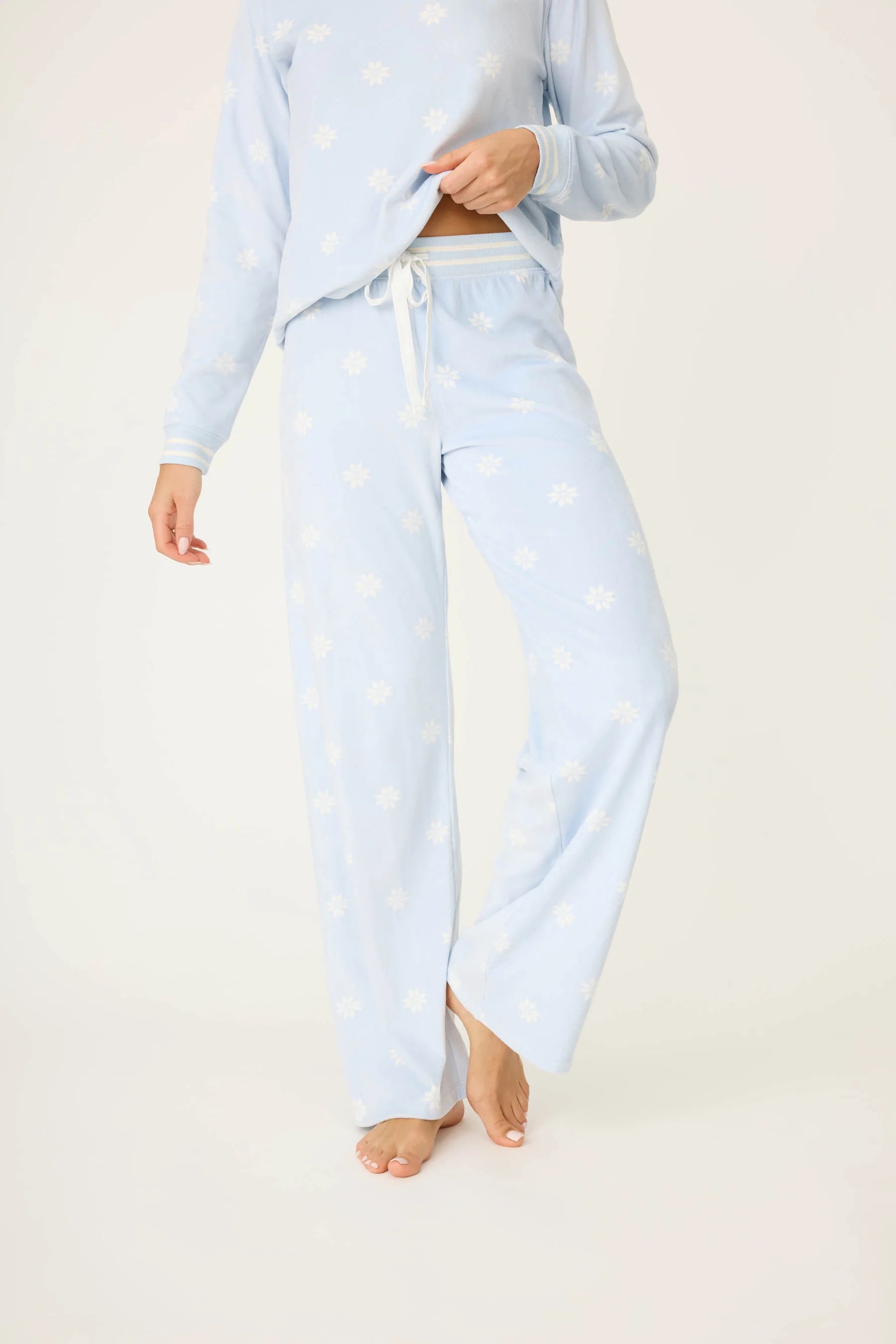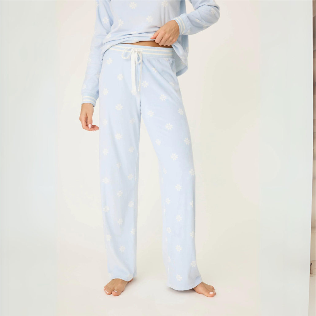 Welcome winter in lounge pants featuring an adorable white snowflake print. Crafted from soft velour fabric, these pants offer ultimate comfort for lounging or sleeping. The tie waist allows for a customizable fit, ensuring you can relax in style. With a charming snowflake pattern and a soothing pale blue hue, these pajama pants are perfect for cozy winter nights and holiday mornings!