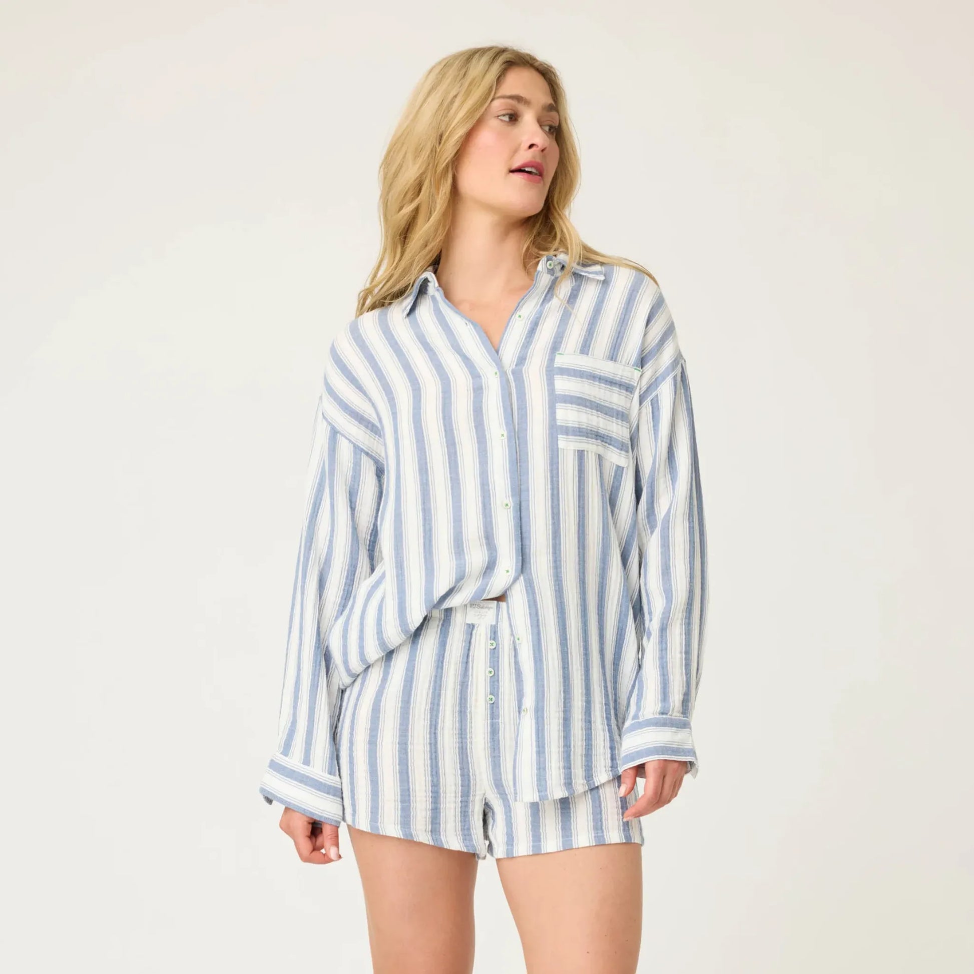 Channeling coastal cool, even if your plans only involve the couch. Crafted from breezy yarn-dyed cotton gauze in soft, sun-faded ivory and blue stripes. Perfect for laid-back lounging, spontaneous beach days, or just pretending you’re on vacation.