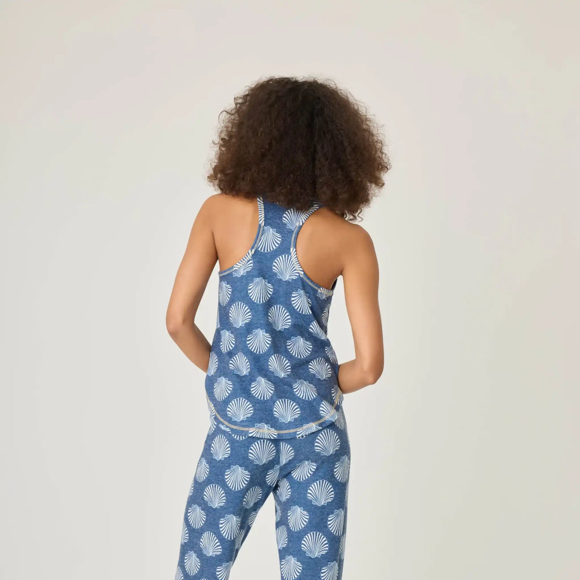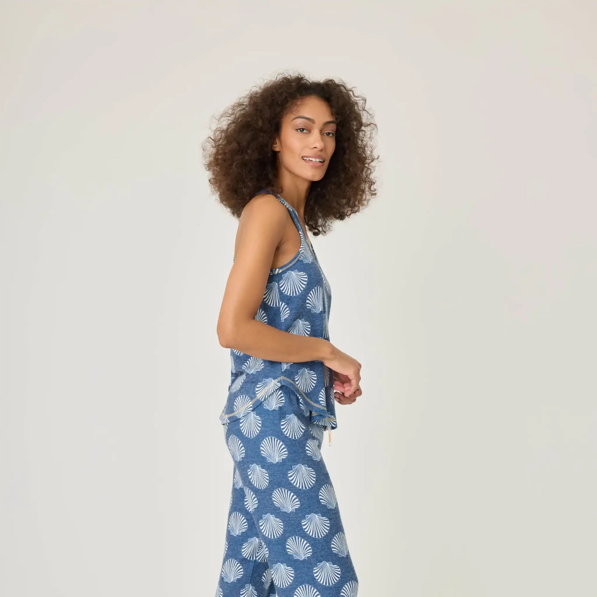 Shell yeah! This lounge set brings coastal relaxation straight to your wardrobe. The navy blue tank top features a playful shell print and racerback design, offering the perfect balance of comfort and laid-back style.