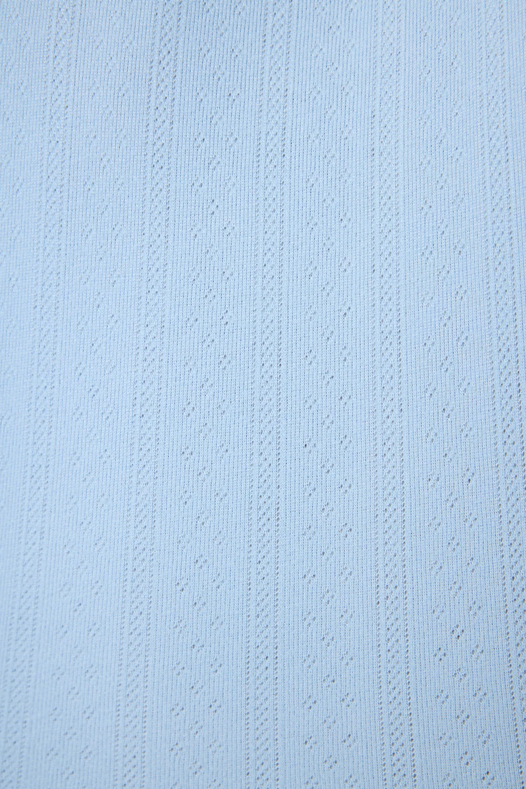 A dreamy blue hue and soft texture define this timeless two-piece pajama set. Crafted from mid-brushed pointelle that’s smooth and lightly textured, it includes a scoop-neck long-sleeve top and relaxed pants accented with delicate scalloped trim and dainty button details—made for cozy evenings and unhurried mornings.