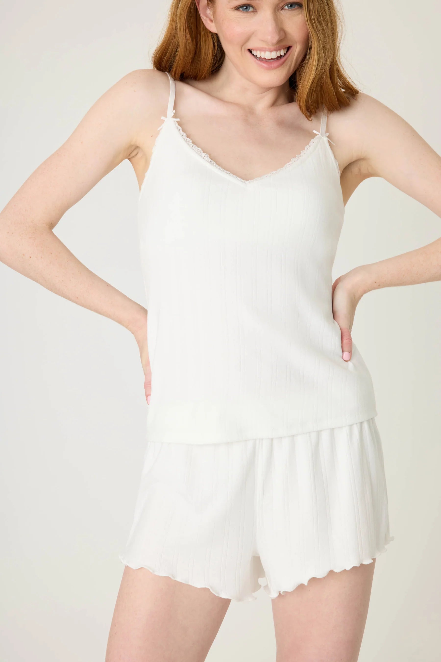 Classic, breathable, and sweet to the core, this cami is crafted from double-brushed pointelle fabric with subtle ribbed texture. Adjustable elastic straps with bow details and delicate lace trim at the neckline and armholes add a charming touch. A dreamy sleepwear essential for layering or lounging solo, all year long.
