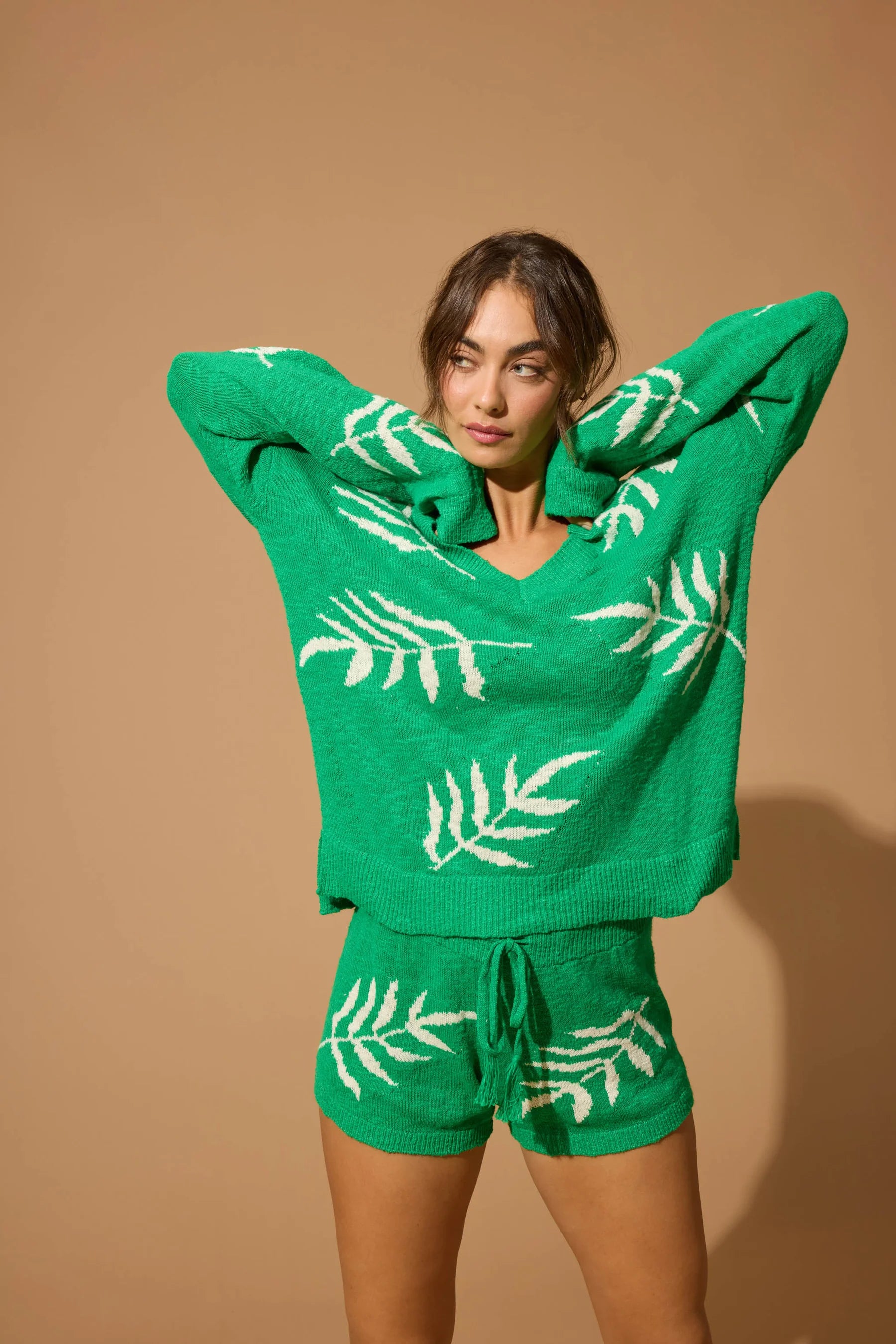 Catch the breeze of tropical nights in this baja‑green slubby sweater top. Crafted from airy cotton‑pucker gauze knit, it features a white palm print, a deep V‑neck, split hems on both sides, and ribbed cuffs and hem for a relaxed, beachy silhouette—perfect for bonfire evenings or laid‑back boardwalk strolls.