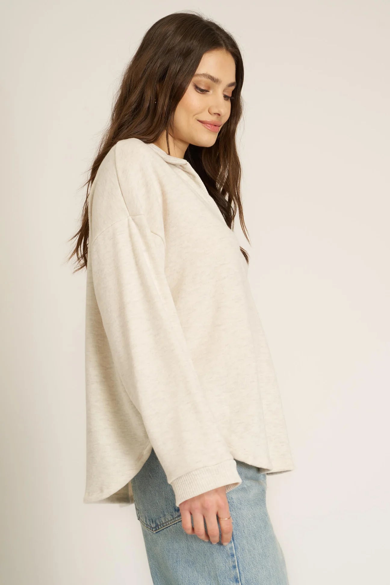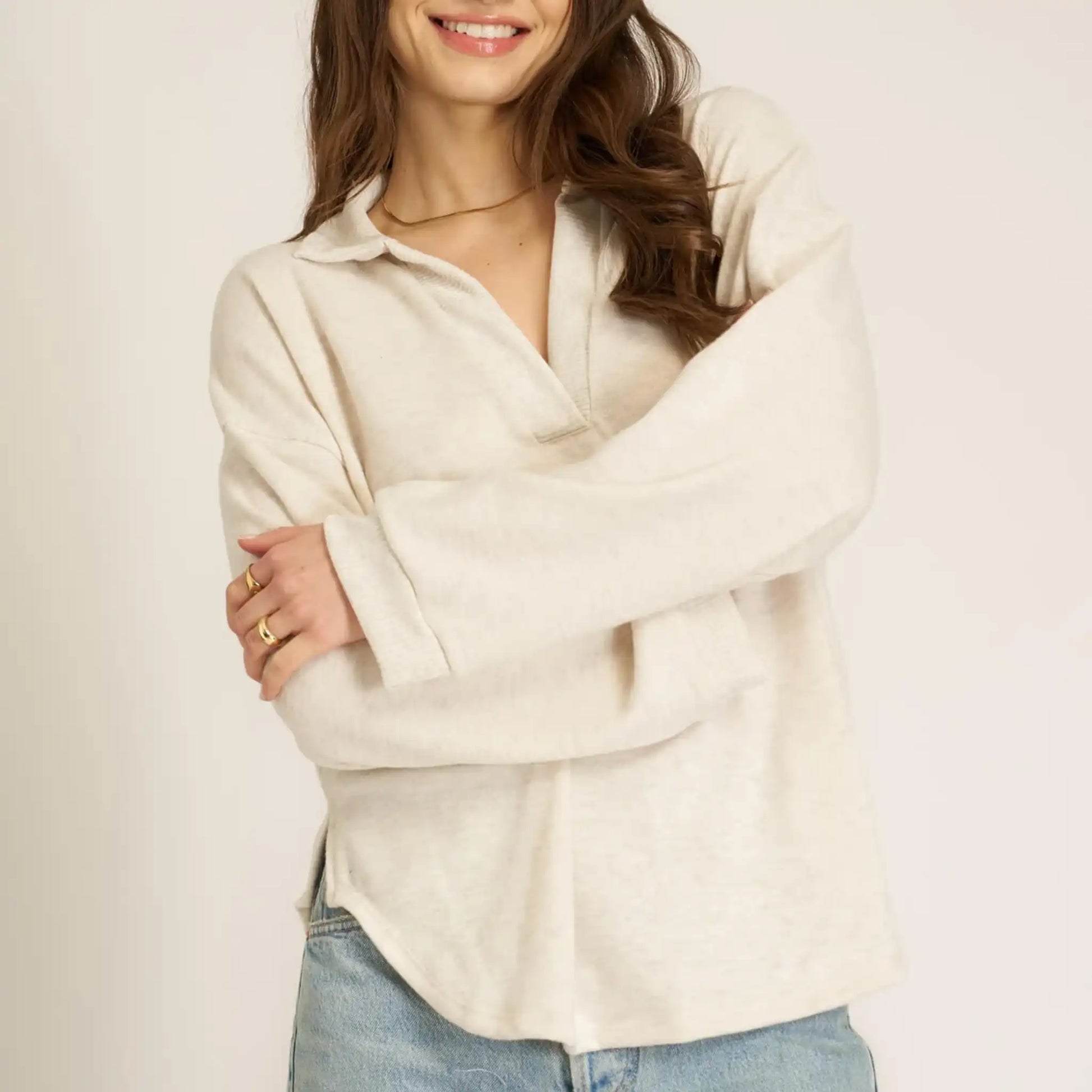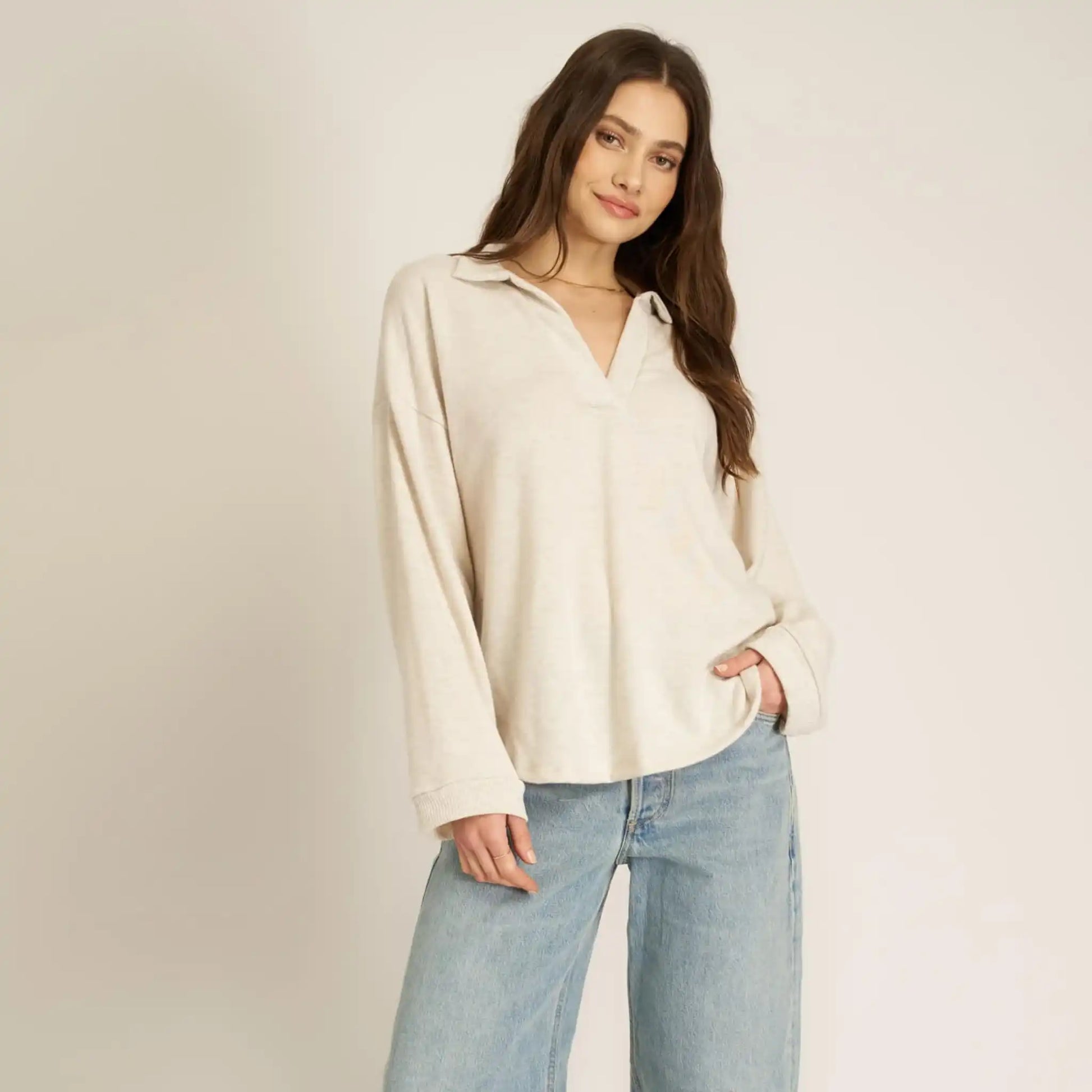 The Chiara Cozy Collared Pullover features a relaxed and oversized fit made from our signature brushed cozy fabric, ensuring you stay comfortable and stylish all day long. The relaxed fit features a collared V-neck and wide sleeves, while contrast ribbed fabric at the wrists and collar adds a touch of dynamic style. Perfect for pairing with your favorite oversized jeans and sneakers, this pullover is your go-to for a laid-back vibe.