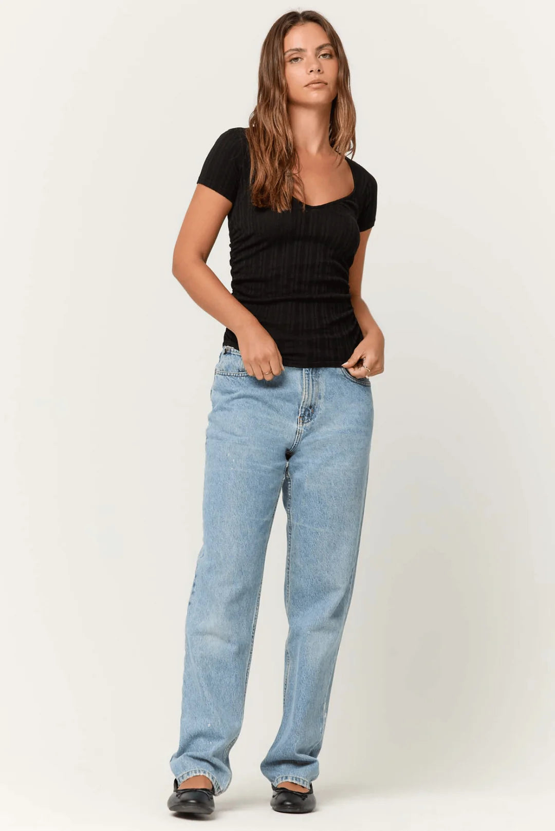 The Dylana Pointelle Sweetheart Neck Tee offers timeless style with a modern edge. Featuring a sweetheart neckline and ruched sides, this form-fitting tee hugs your shape in all the right ways. The subtle vertical pointelle detailing gives the fabric texture and interest, while the soft pointelle fabric adds a delicate touch. Perfect for layering or wearing solo, this tee brings a little something extra to your everyday wardrobe.