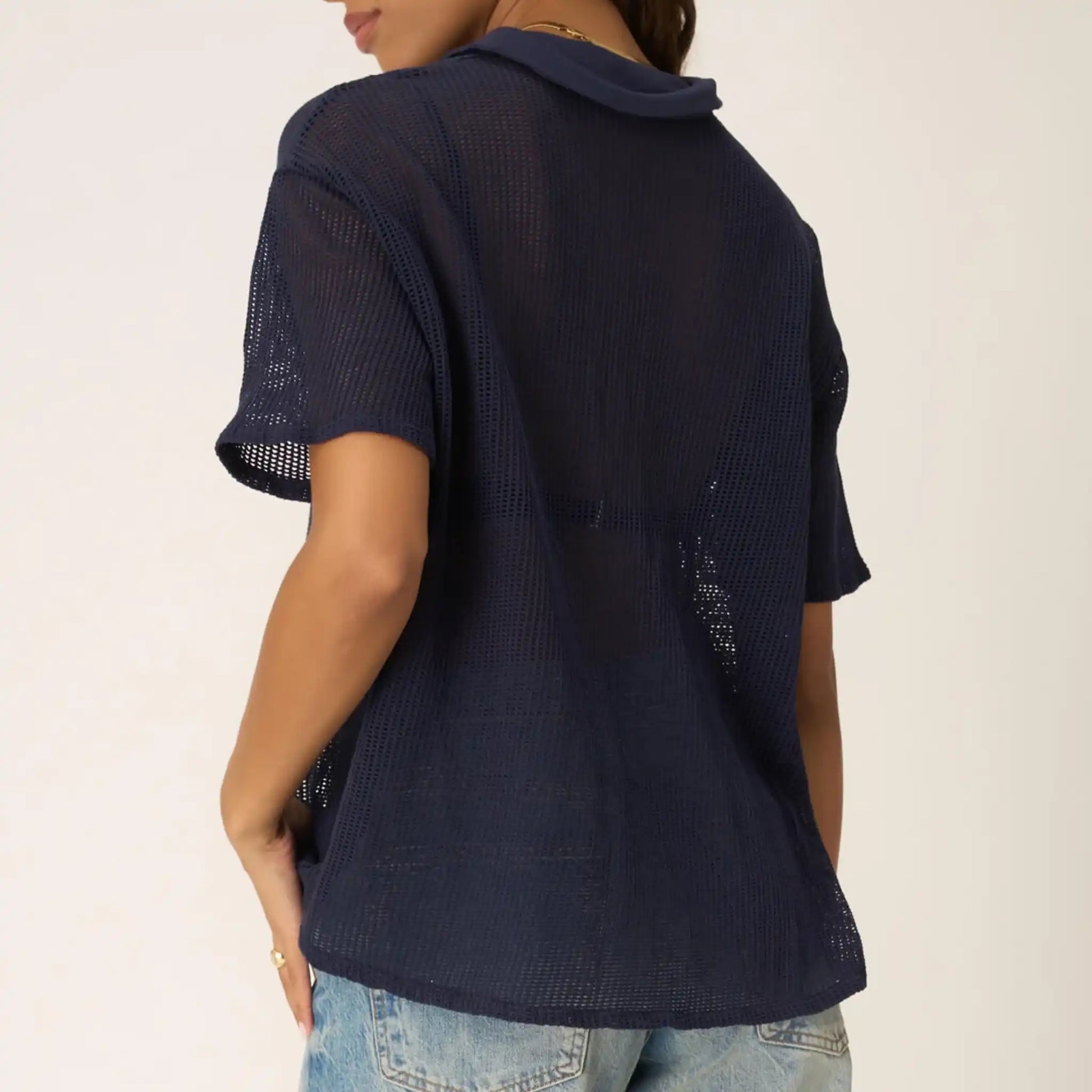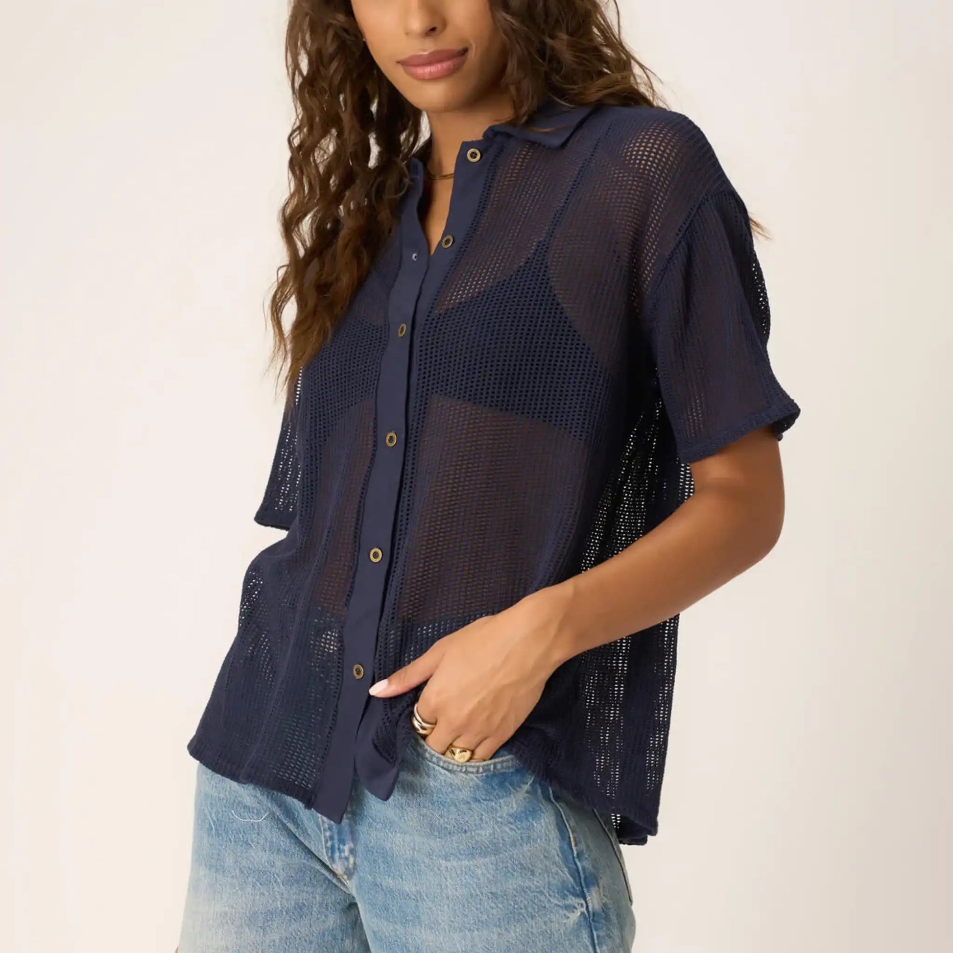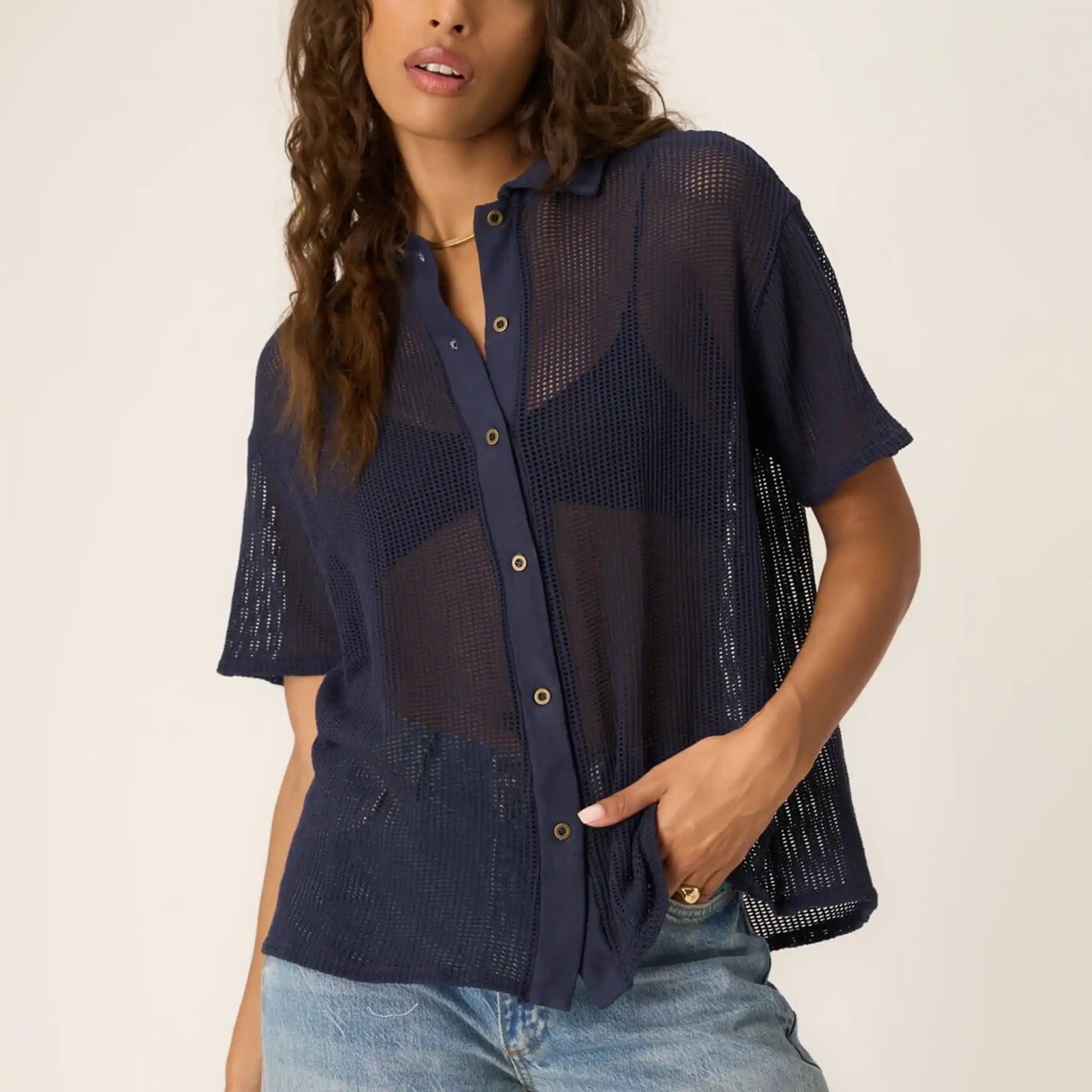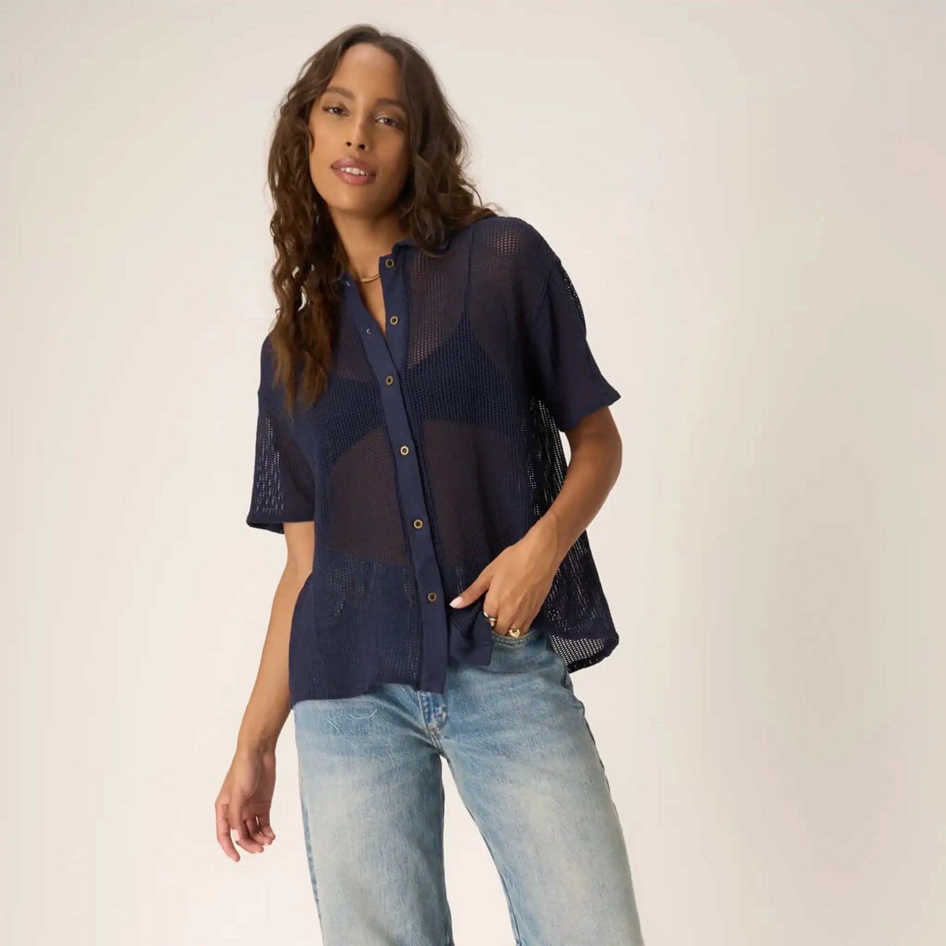 The Sonja Button Front Collared Heavy Mesh Tee is made of 100% cotton and is sure to be your new summer go-to. The chunky mesh fabric is fun to layer over a bathing suit or feminine bralette, while the collared neckline, drop shoulders, and functional antiqued brass buttons down the front keep it a refined style. Pair with baggy jeans or a mini skirt and head out the door.