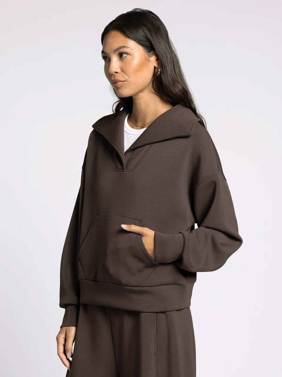 So cozy and essential, this wear-everywhere pullover features a v neck design with pouch pocket detail and drop shoulder for added dimension. Pair with the Alana Pant to make it a set!