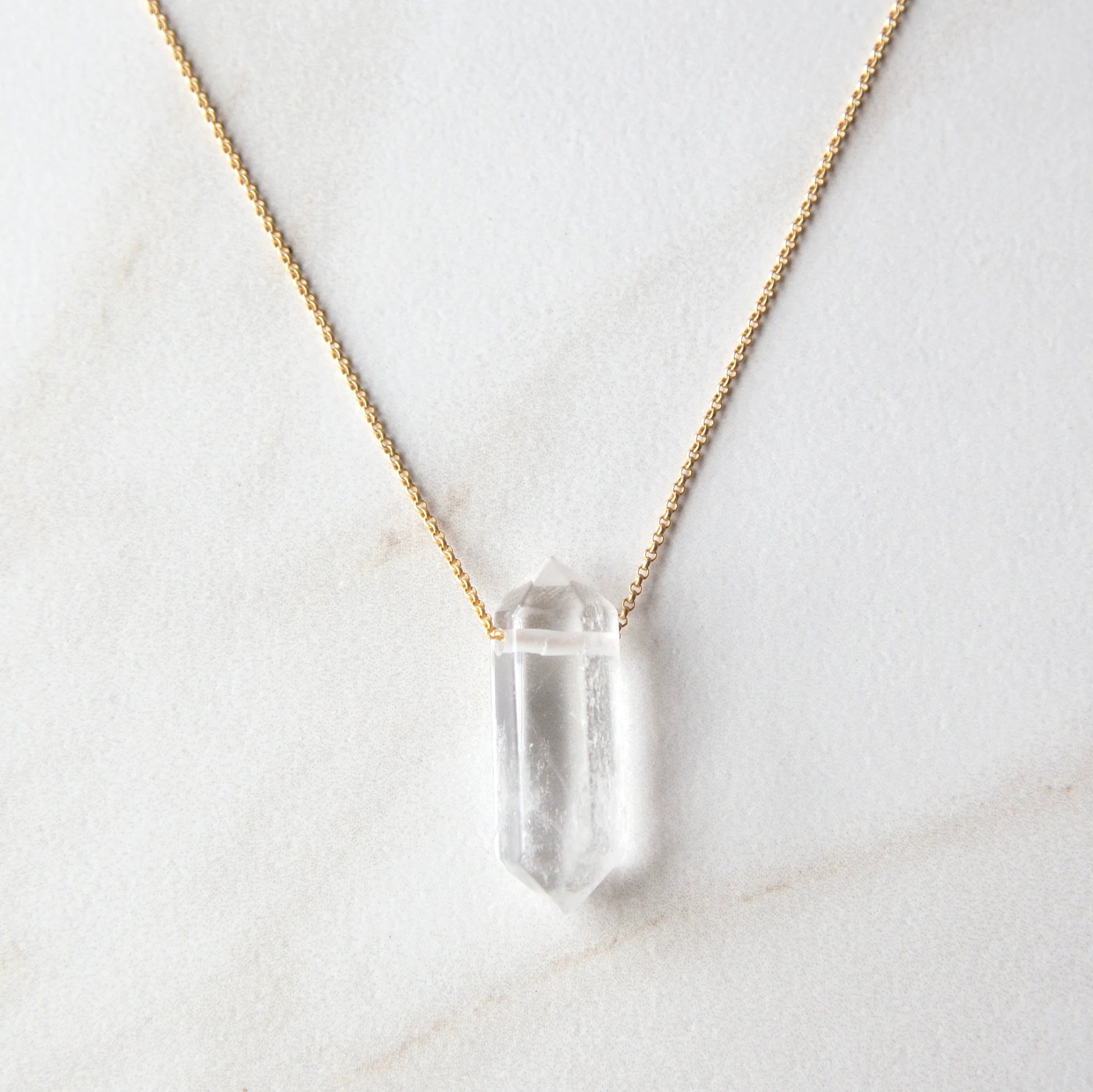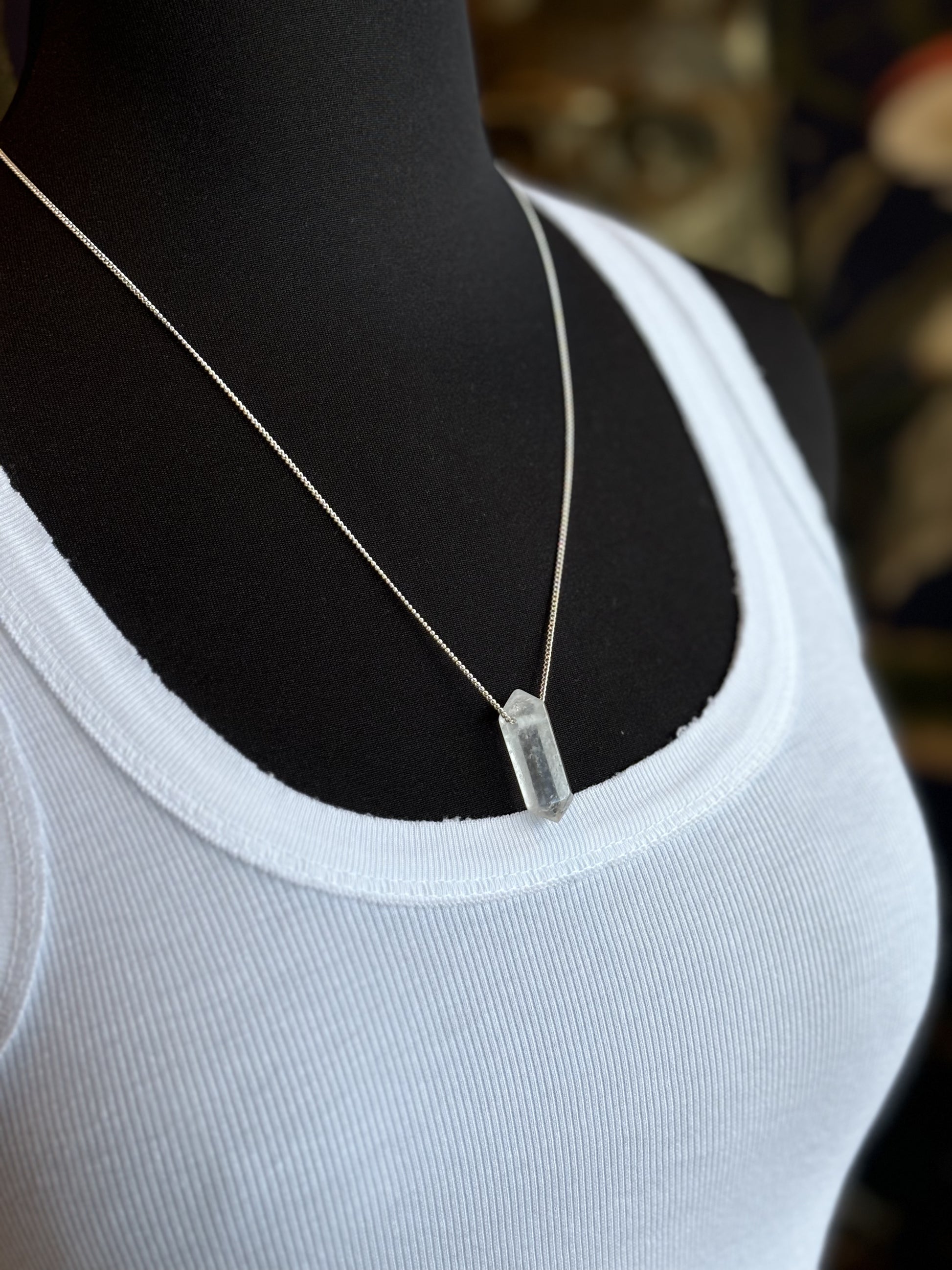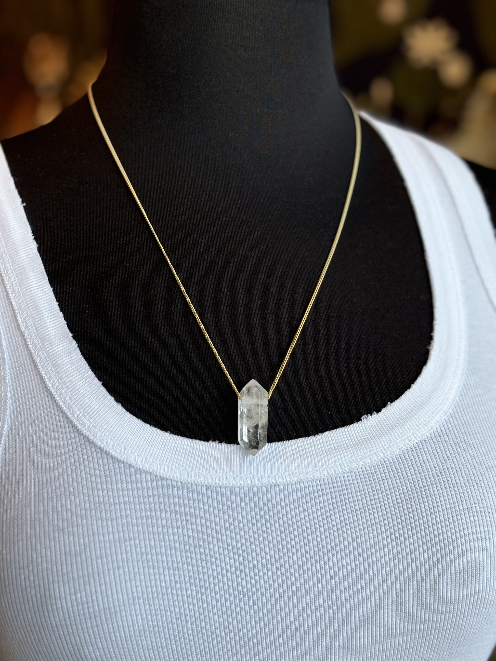 A clear quartz crystal slides on a gold-plated or silver-plated chain. Chain measures 20'' with a 1.5'' extender. All metals are hypoallergenic and nickel free.