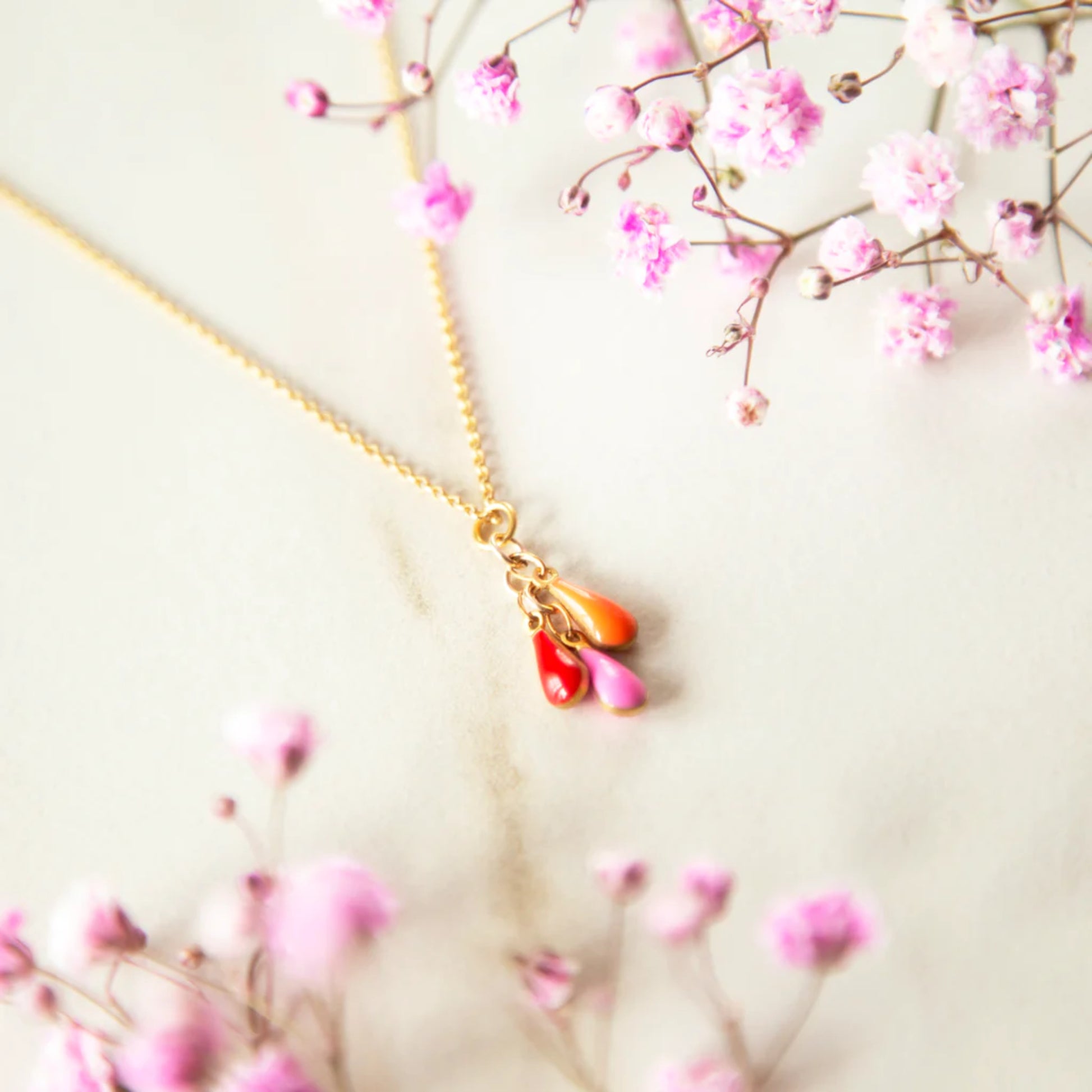 Three colorful, teardrop-shaped confetti beads hang from an 18" chain with a 1.5" extender. This design looks great layered with the Jessie Necklace, or on it's own as a pop of color for your outfit!
