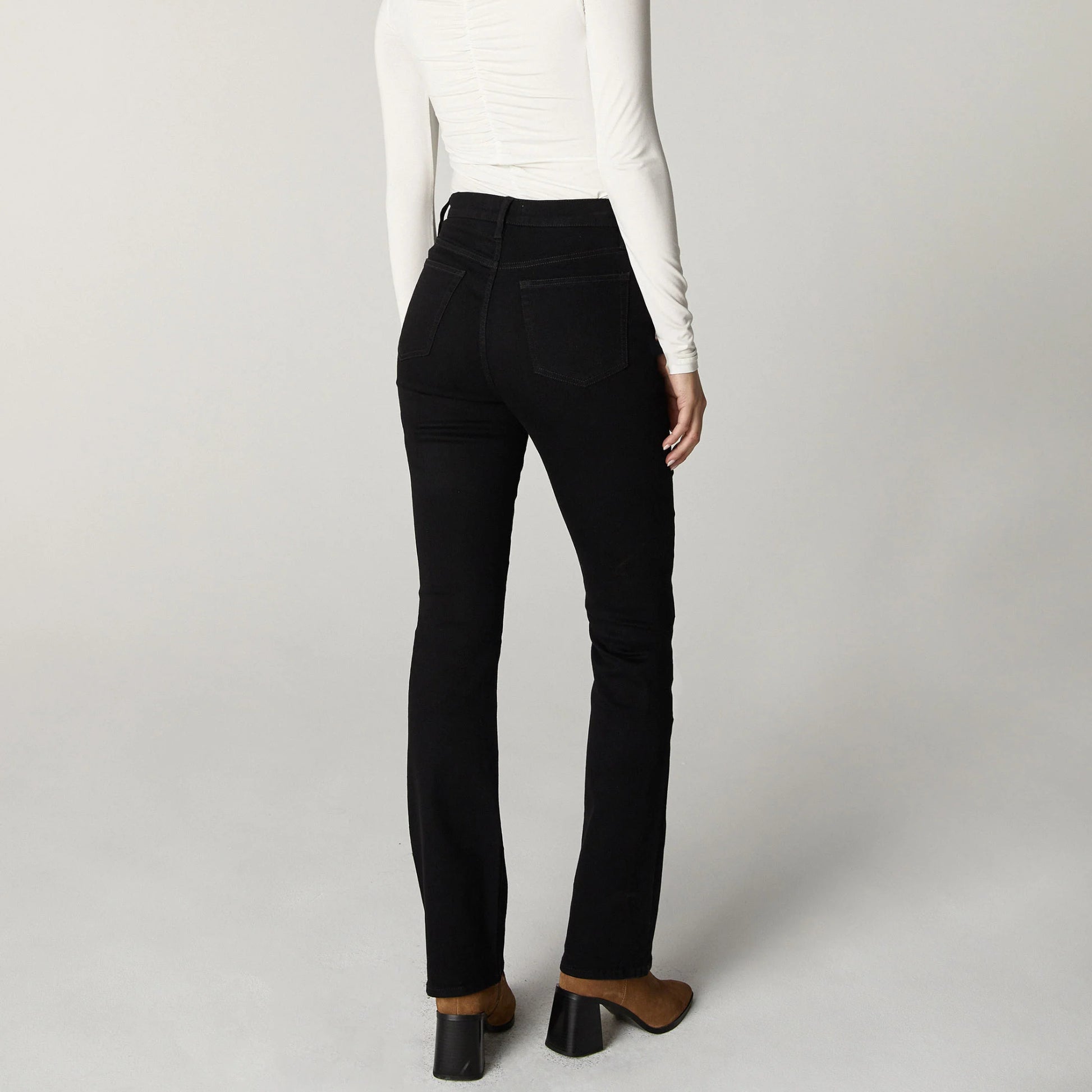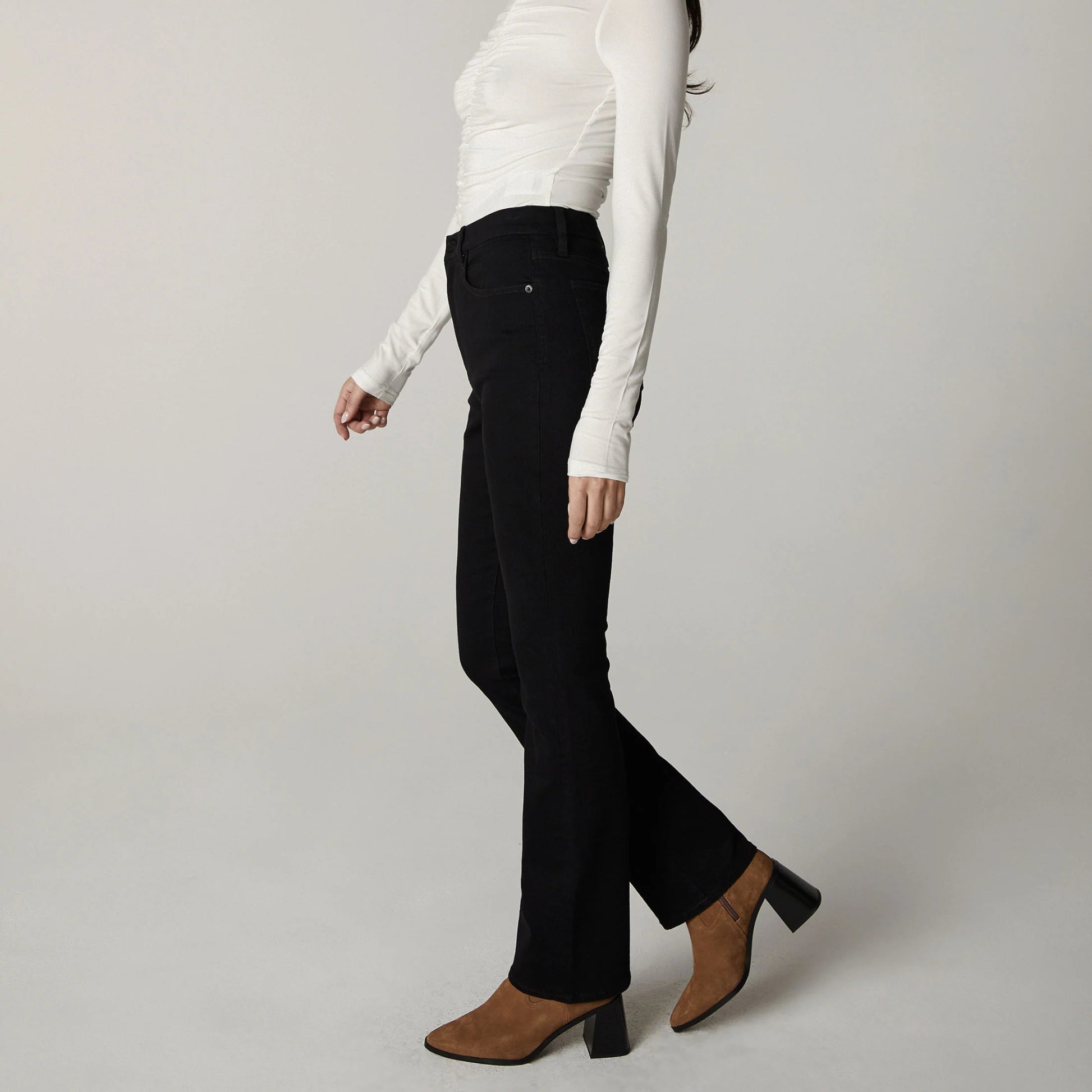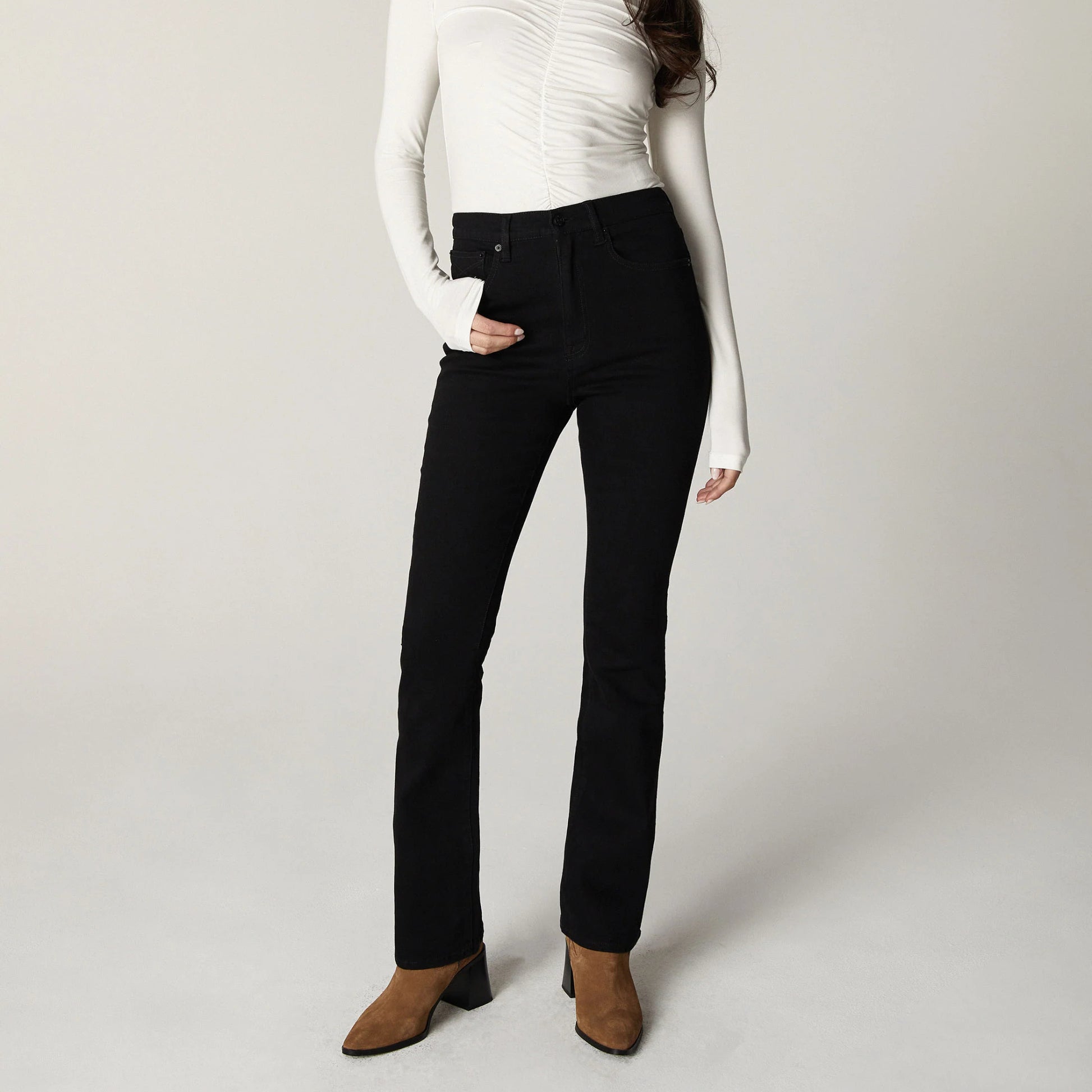 Chloe, the slim boot fit. High-rise and slightly flared below the knee. Featuring 5-pocket styling and antique nickel hardware.