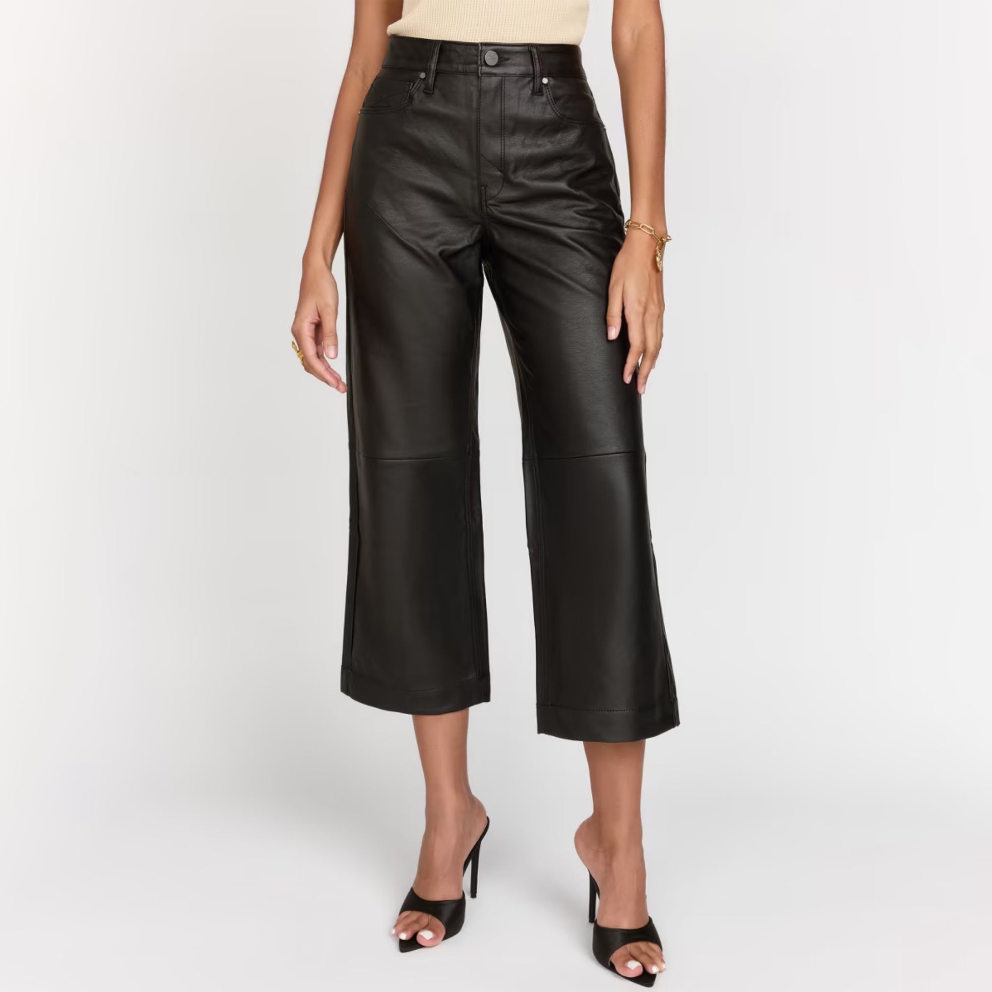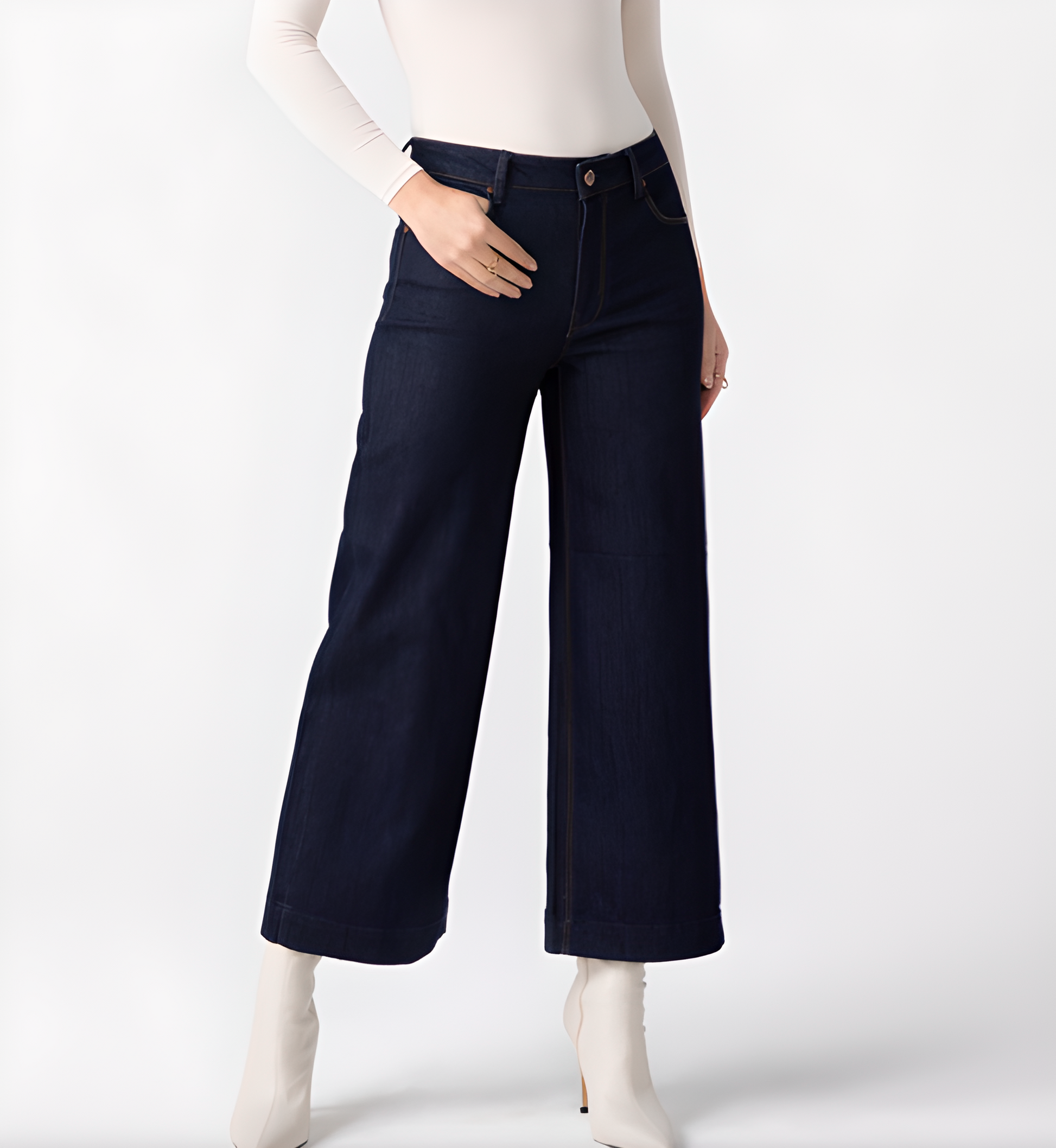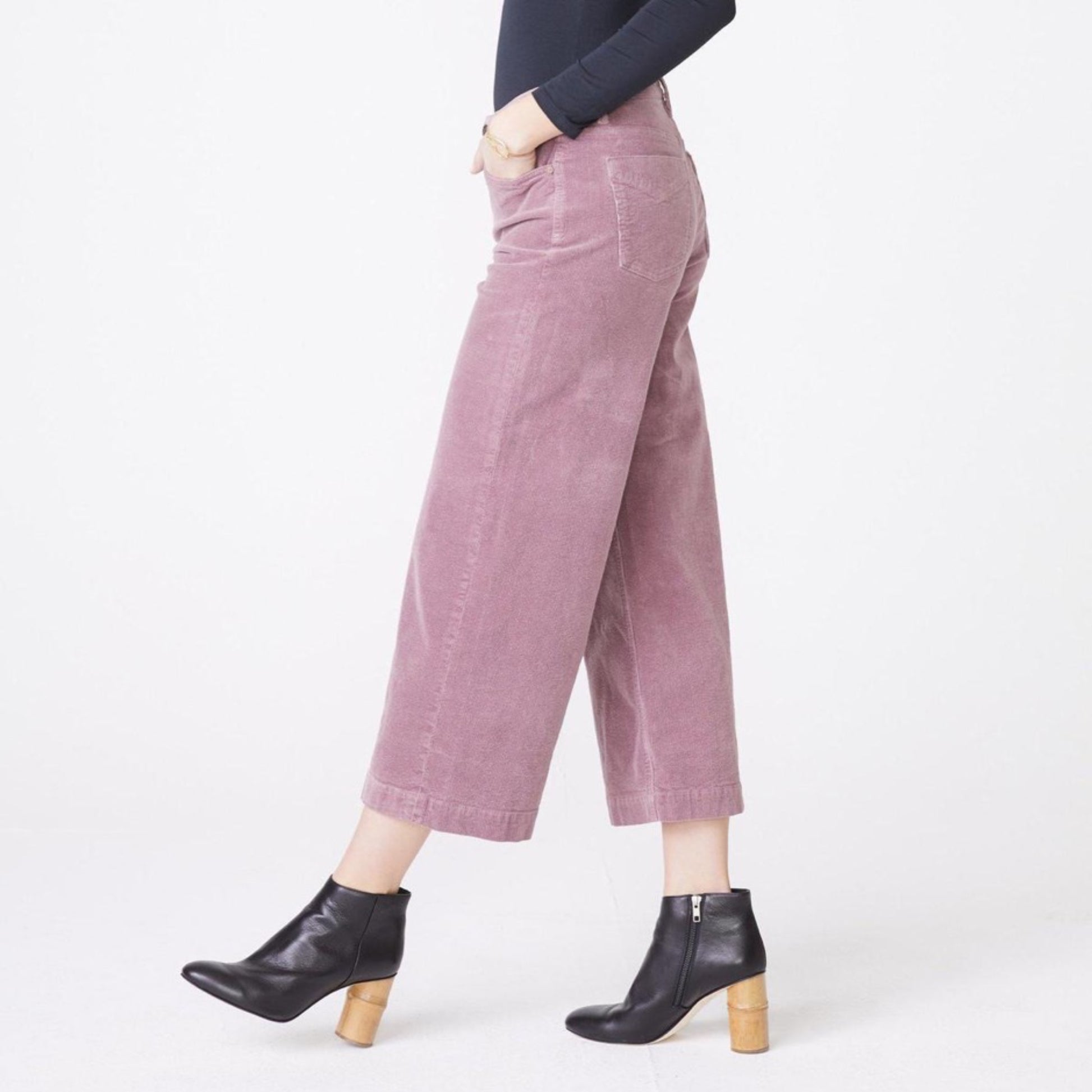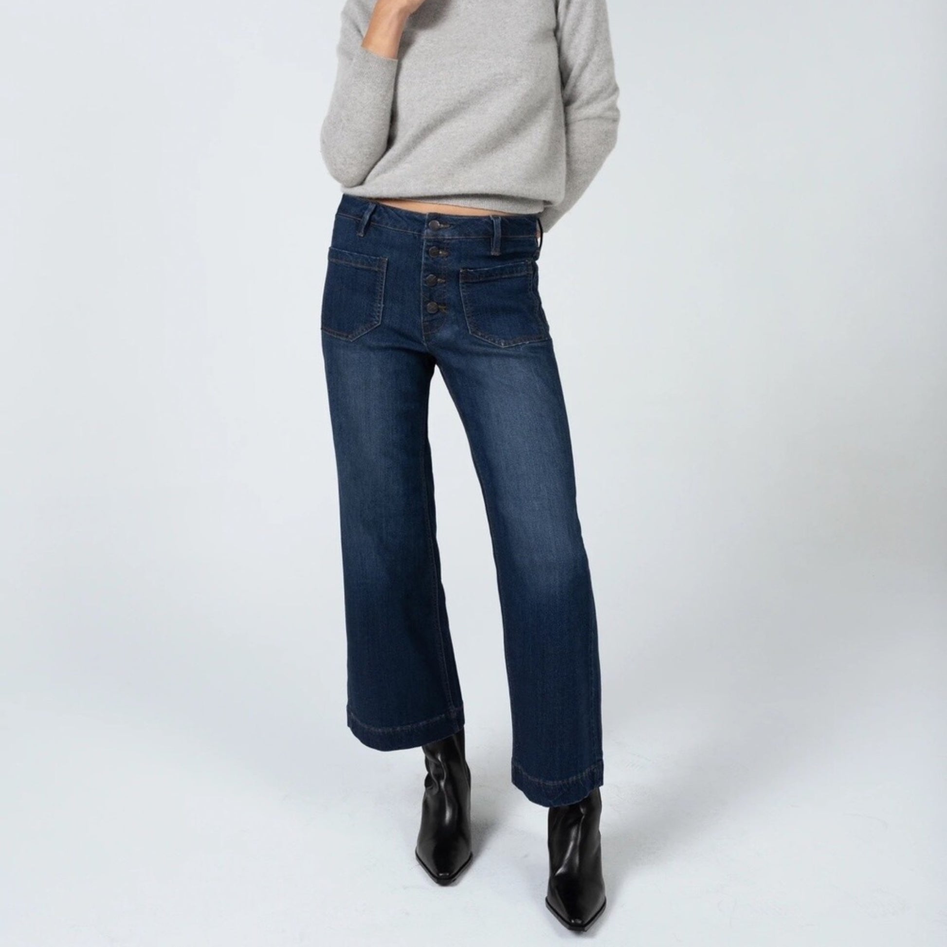 Greta, our mid-rise wide leg crop and a fan favorite. This style sits at natural waist, is fitted through the hips, and then fully relaxes into a cropped wide leg. Featuring 5-pocket styling and antique nickel hardware.