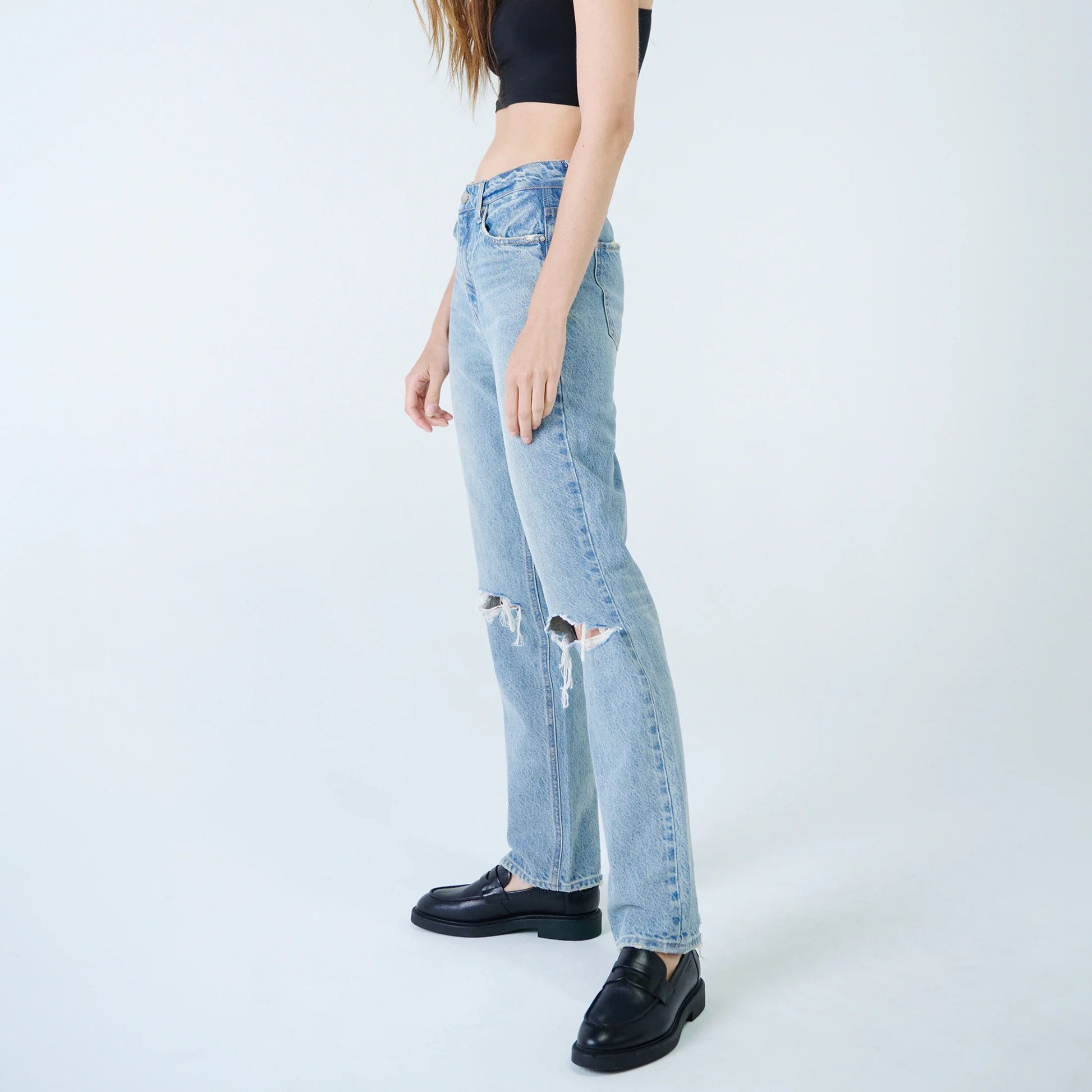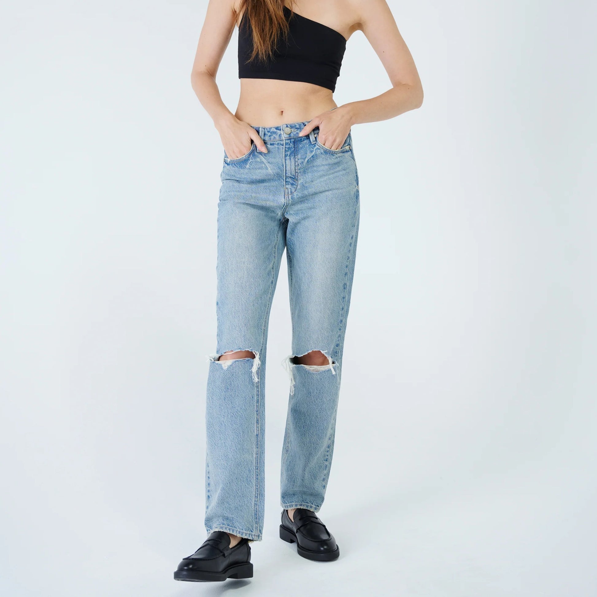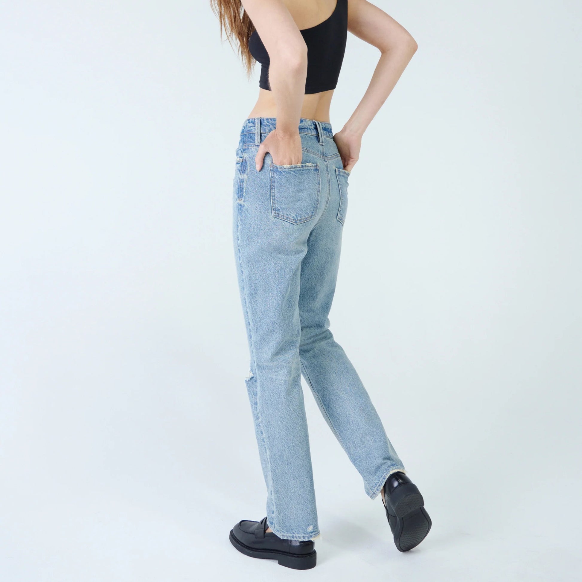 - The must-have jean with an 11" rise, this style is made in our comfort stretch denim that is fitted through the hips and falls into the ideal straight leg. Light wash denim featuring a blown-out knee detail for an everyday, chill look. 5-pocket styling with a button and zip fly closure.